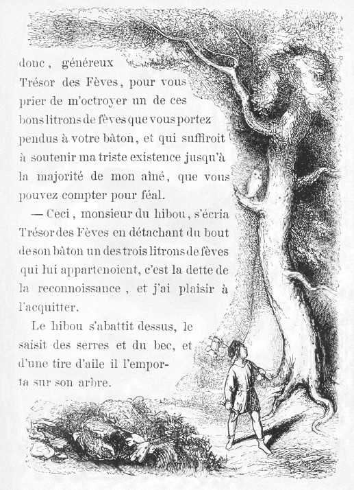 —Est-il vrai? dit Trésor des Fèves en dressant son regard jusqu’au sommet d’un vieux pin caverneux et demi-mort, sur lequel un maître hibou se berçoit lourdement au souffle du vent; et qu’avons-nous à démêler ensemble, mon bel oiseau?