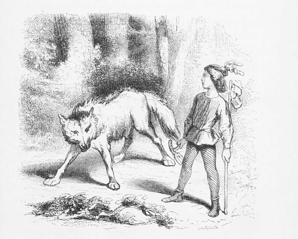 Et Trésor des Fèves se remit en chemin, allégé de deux de ses litrons, et cherchant du regard les murailles de la ville, quand il s’aperçut, à quelque bruit qui se faisoit sur la lisière du bois, qu’il devoit être suivi de près. Il s’avança soudainement de ce côté, sa serfouette ouverte à la main; et bien lui en prit, car le compagnon qui l’escortoit à pas de loup n’étoit autre qu’un vieux loup dont la physionomie ne promettoit rien d’honnête.