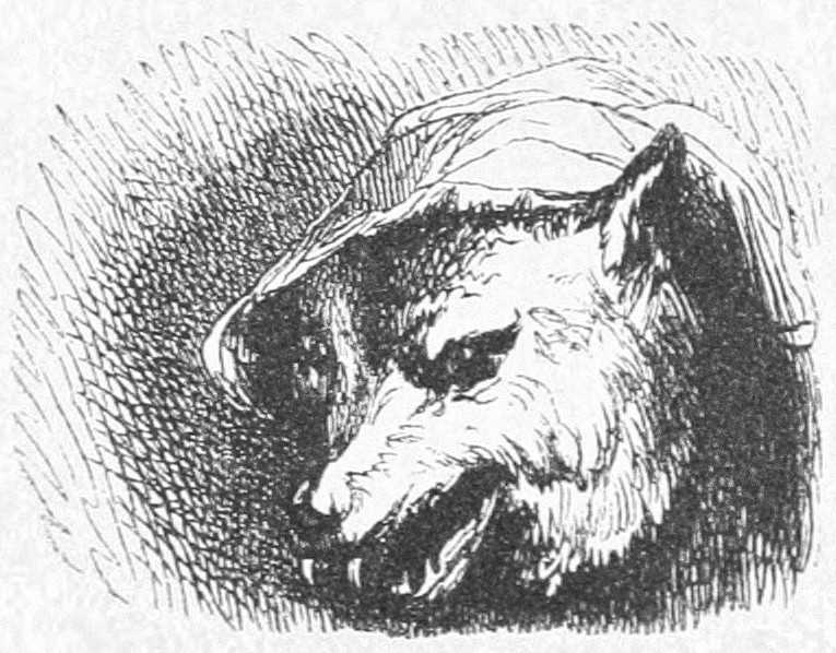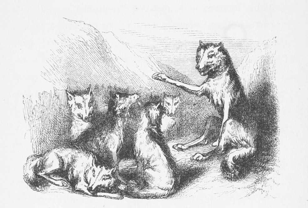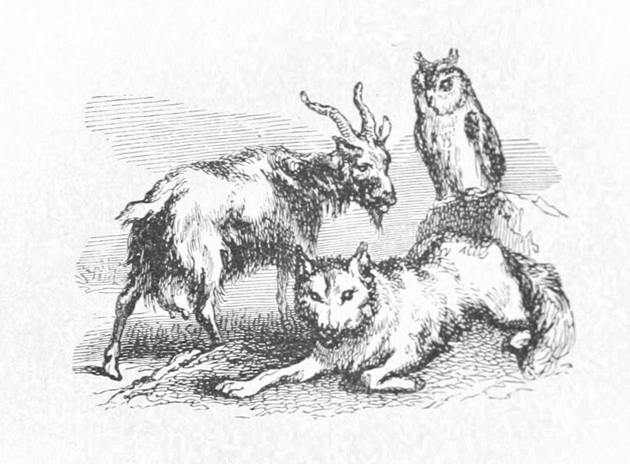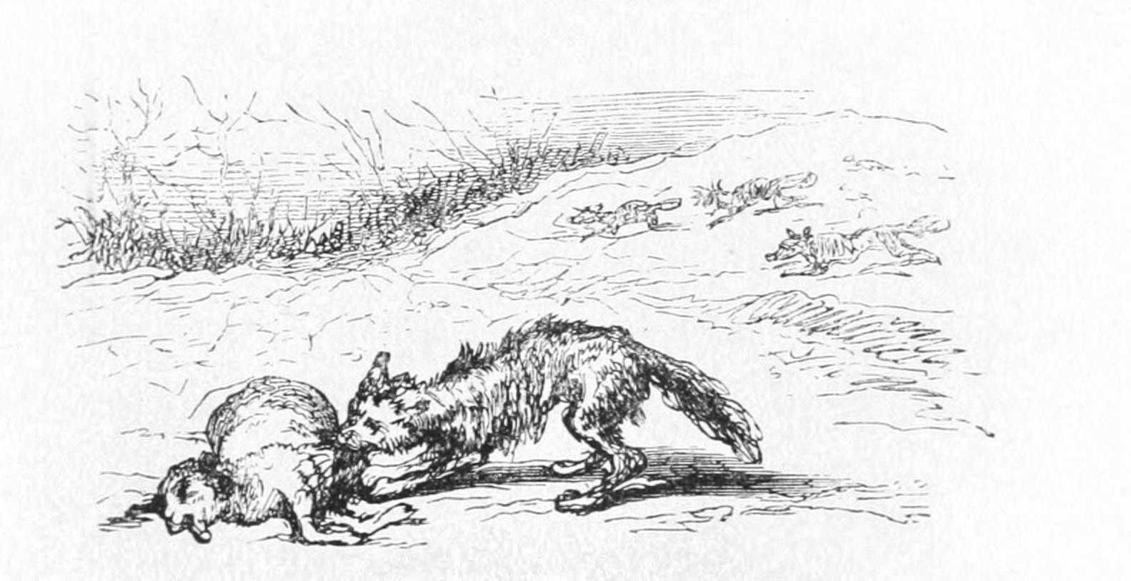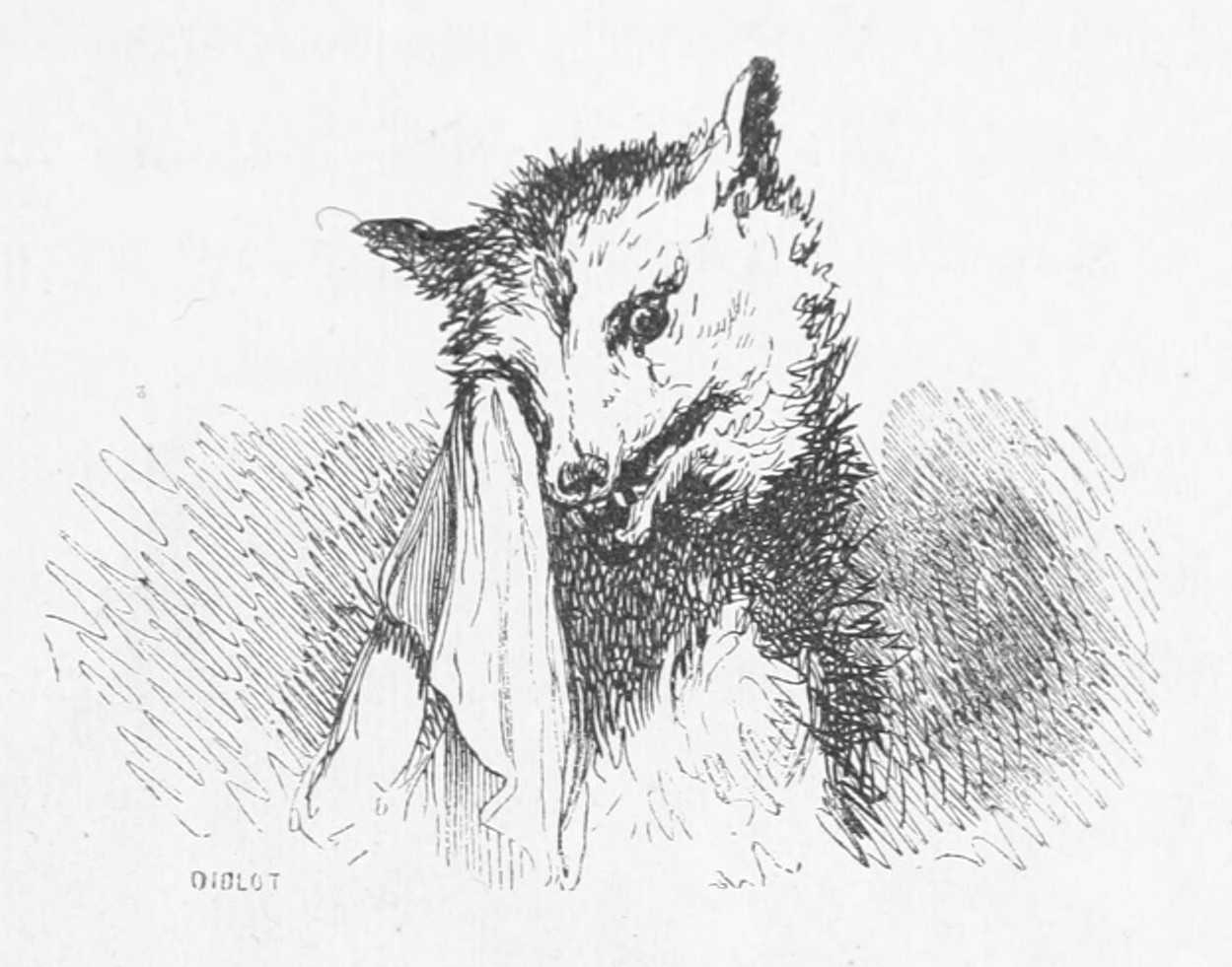 Le loup, qui avoit écouté jusqu’alors en toute humilité, partit subitement d’une longue et plaintive exclamation, en élevant les yeux au ciel comme pour le prendre à témoin.
