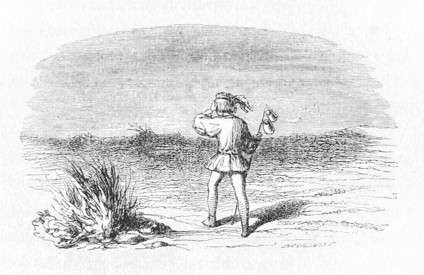 Trésor des Fèves marcha, marcha, faisant des enjambées terribles comme un homme de cinq pieds, et regardant deci, delà, les choses d’apparence inconnue qui se trouvoient sur sa route; car il n’avoit jamais pensé que la terre fût si grande et si curieuse. Cependant, quand il eut marché plus d’une heure, ce qu’il jugeoit à la hauteur du soleil, et comme il s’étonnoit de n’être pas encore rendu à la ville au train qu’il étoit allé, il lui sembla qu’on lui crioit: