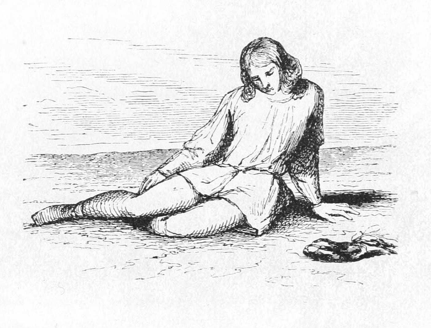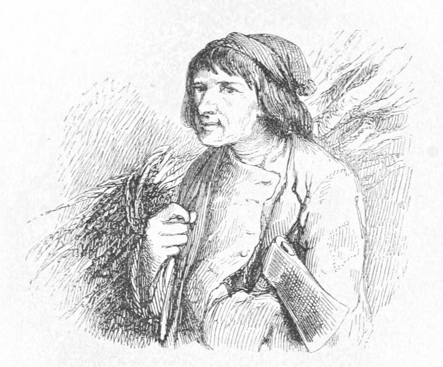 demi à douze ans; et quand il travailloit dans son champ de fèves, qu’il tenoit en grande affection, vous l’auriez à grand’peine aperçu de la route; mais il étoit si bien pris dans sa petite taille, si avenant de figure et de façons, si doux et cependant si résolu en paroles, si brave dans son sarrau bleu de ciel à rouge ceinture, et sous sa fine toque des dimanches au panache de fleurs de fèves, qu’on ne pouvoit s’empêcher de l’admirer comme un vrai miracle de nature, en sorte qu’il y avoit nombre de gens qui le croyoient génie ou fée.
