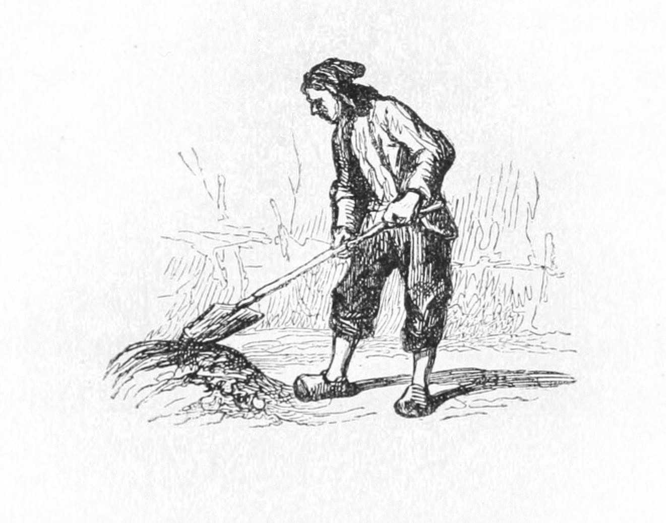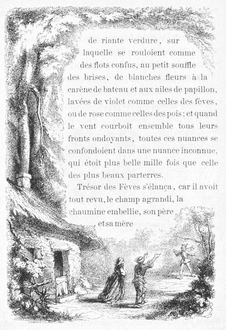 Au milieu de cette abondance, Trésor des Fèves suffisoit à toutes choses, retournant la terre, triant les semences, mondant les plants, sarclant, fouissant, serfouant, moissonnant, écossant, et, de surcroît, entretenant soigneusement les haies et les échaliers; après quoi il employoit le temps qui lui restoit à recevoir les acheteurs et à régler les marchés, car il savoit lire, écrire et calculer sans avoir appris: c’était une véritable bénédiction.