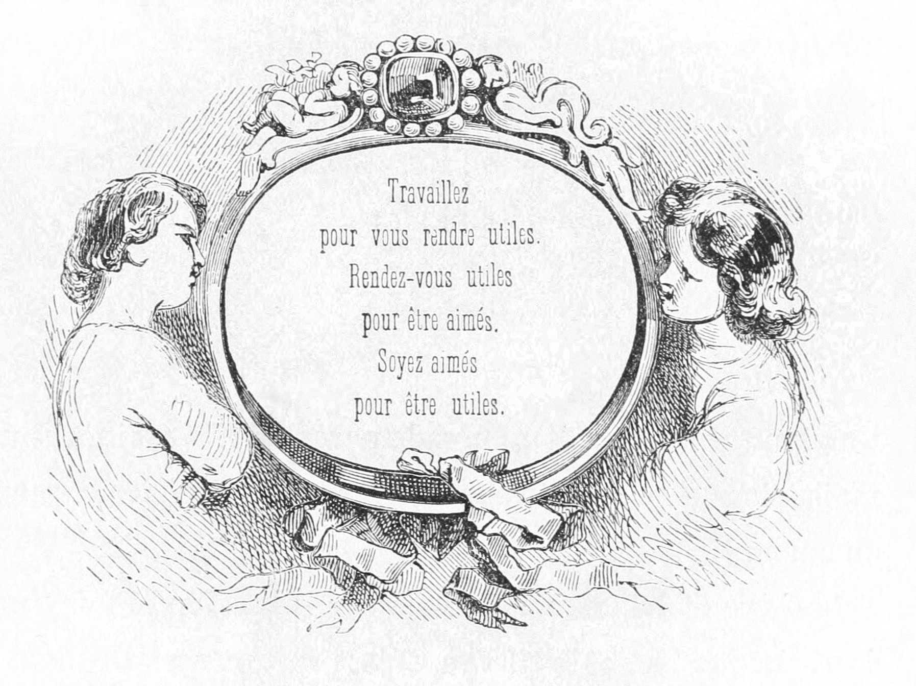 «Travaillez, aimables enfants, leur dit-il, votre bonne aïeule le permet, et vous pouvez reconnoître à son émotion le plaisir qu’elle éprouve à vous contenter. Travaillez avec modération, car un travail excessif brise les meilleurs esprits, comme une culture trop exigeante épuise le sol le plus productif. Amusez-vous quelquefois, et même souvent, car les exercices du corps sont nécessaires à votre âge, et tout ce qui délasse la pensée d’un travail suspendu à propos la rend plus capable de le reprendre sans effort. Revenez au travail avant que le plaisir vous ennuie; les plaisirs poussés jusqu’à l’ennui dégoûtent du plaisir. Rendez-vous utiles enfin pour vous rendre dignes d’être aimés, et, comme disoit le talisman, Soyez Aimés Pour Être Heureux. S’il existe un autre bonheur sur la terre, je n’en sais pas le secret.»