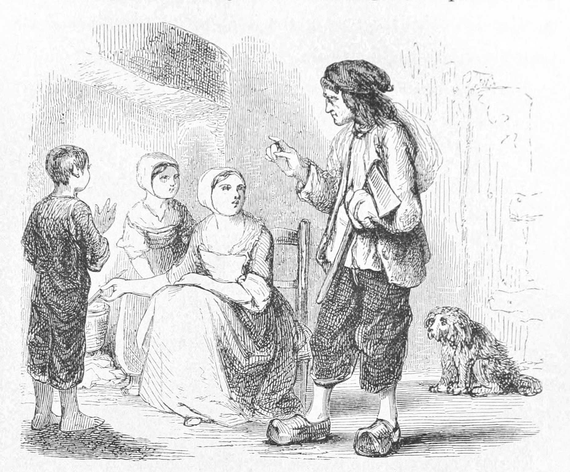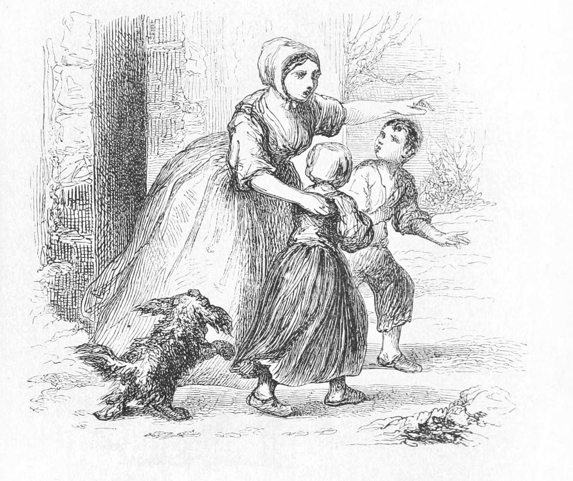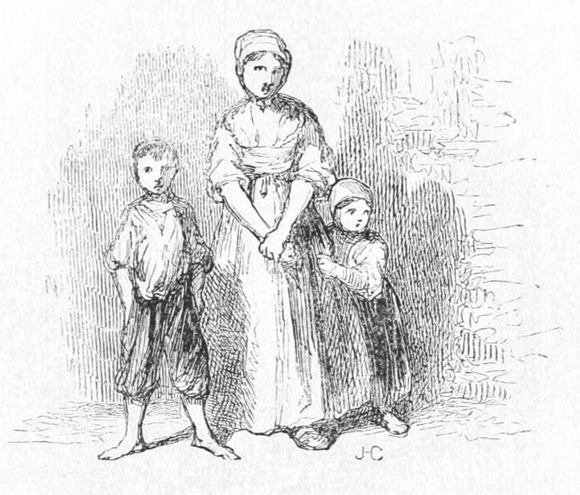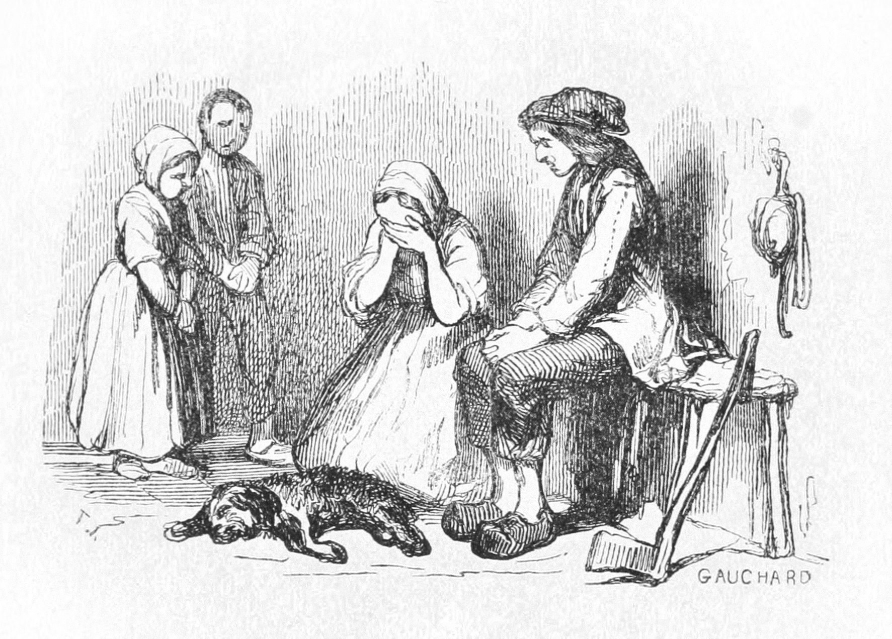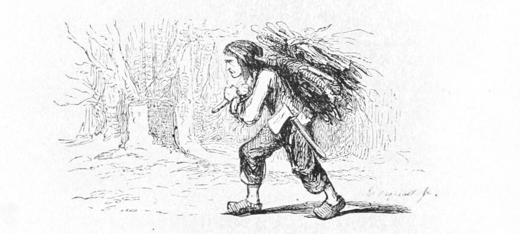 Pendant ce temps-là, Brisquet était revenu par le grand chemin de Puchay, en passant à la croix aux Anes sur l’abbaye de Mortemer, parce qu’il avoit une hottée de cotrets à fournir chez Jean Paquier.—«As-tu vu nos enfants?» lui dit Brisquette.