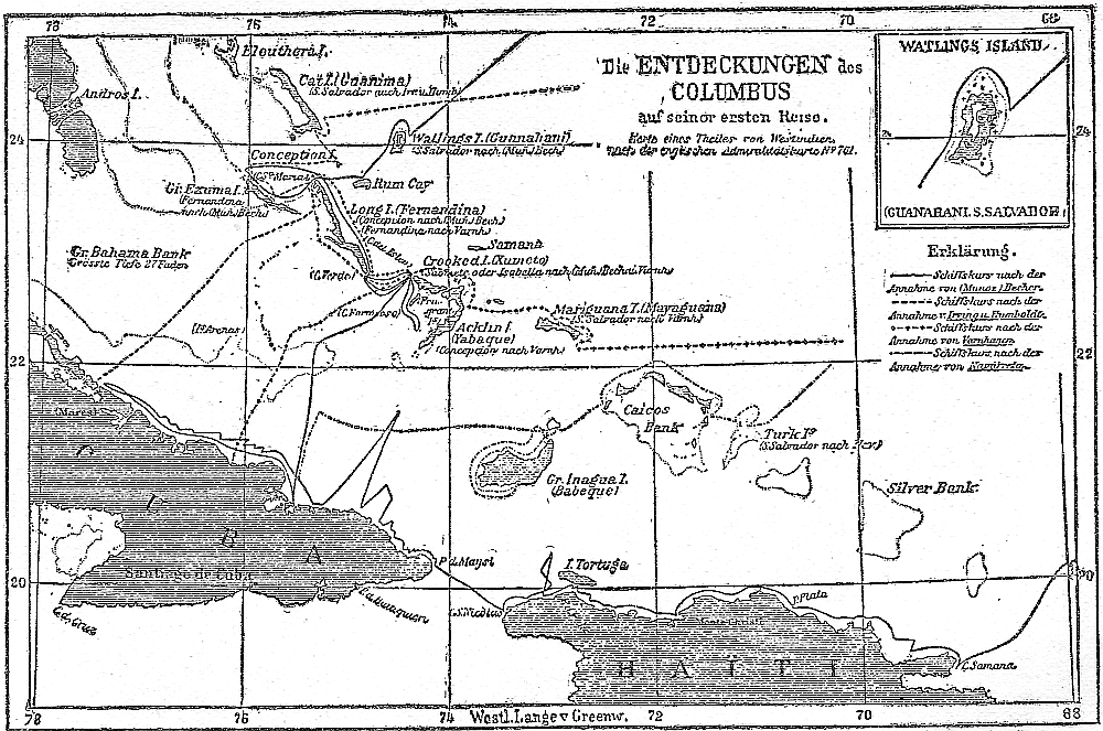 Embarks at Palos, August 3, 1492. A mishap befalls the Pinta. Sees the Peak of Teneriffe in eruption. Arrives at the Canaries. Falsifies his reckoning to conceal from his crew the length of the voyage. On September 13th his compass points to the true north, a fact without precedent. Next day a water wagtail is seen, betokening an approach to land. Two pelicans alight on board, with the same significance. These promises fail, and the crew becomes disheartened and discontented. On October 11th Columbus sees a light, presumably on shore: four hours later, next day, land is descried and named by Columbus San Salvador. Discussion as to where this place is: the balance of probability inclines to Watling's Island.