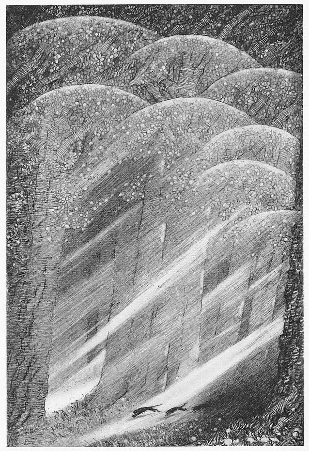 “But it was not long before a very strange and beautiful scent blew through the wood, on a wind that happened to come that way from the downs outside. We both lifted our noses, and sure enough it was a hare. We ran out of the wood, and we very soon saw him; he was running over the downs on three legs, in that indolent affected manner that hares have. He stopped and sat up and looked at us, as though he hadn’t expected to meet two great hunters. Then he went on again. We raced to a point ahead of him, so as to meet him when he got there, and we soon made him put down that other hind leg. Unfortunately before he got to the point that we aimed at, he turned. This happened to leave us straight behind him. We shouted out that we were hunting him, and that we were great hunters, Lion-hunter and I, and{116} that nothing ever escaped from us, and that nothing ever would. This so alarmed him that he went faster. When he came to a ridge of the downs he slanted to his left, and we slanted more, so as to cut him off; but when we got over the ridge he had turned again. We shouted to him to stop, as it was useless to try to escape from us; but the tiresome animal was by now some way ahead. He had of course the white tail that is meant to guide us, the same as the rabbit has; and we kept him in sight for a long while. When he was no longer in sight we followed the scent, which Lion-hunter could do very well, though he was not as fast as I; and it led us to places to which I had never been before, over a great many valleys. We puzzled out the scent and followed on and on, and we did not give up the hunt until all the scent had gone, and nothing remained except the smell of the grass, and the air that blew from the sheep. Night came on rather sooner than usual, and we did not know where we were, so we turned for home.{117}”