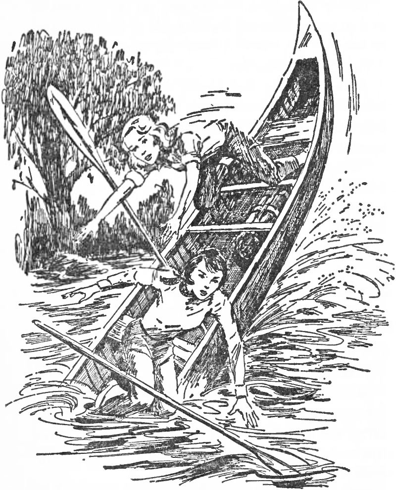 The next second something rammed the canoe violently. The impact capsized the craft, hurling Nancy and Helen into the chilly May water!