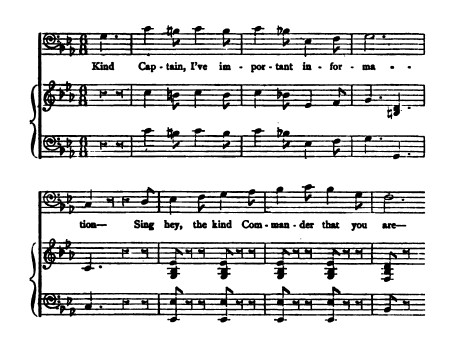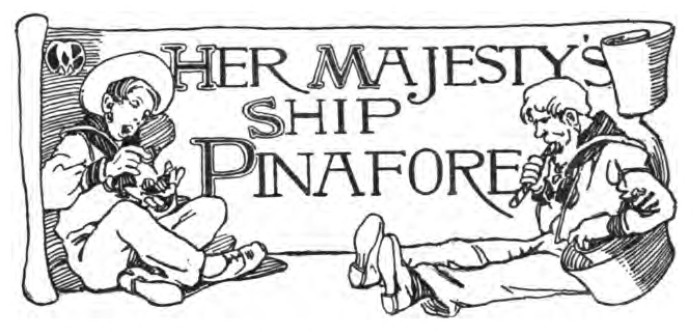 One of the finest and most perfectly manned ships in that magnificent Fleet was Her Majesty’s Ship Pinafore, and I call the ship “Her Majesty’s” because she belonged to good Queen Victoria’s time, when men-of-war were beautiful objects to look at, with tall tapering masts, broad white sails, and gracefully designed hulls; and not huge slate-coloured iron tanks without masts and sails as they are to-day. She was commanded by Captain Corcoran, R.N., a very humane, gallant, and distinguished officer, who did everything in his power to make his crew happy and comfortable. He had a sweet light baritone voice, and an excellent ear for music, of which he was extremely fond, and this led him to sing to his crew pretty songs of his own composition, and to teach them to sing to him. To encourage this taste among his crew, he made it a rule on board that nobody should ever say anything to him that could possibly be sung—a rule that was only relaxed when a heavy gale was blowing, or when he had a bilious headache. Harmless improving books were provided for the crew to read, and vanilla ices, sugar-plums, hardbake and raspberry jam were served out every day with a liberal hand. In short, he did everything possible (consistently with his duty to Her Majesty) to make everybody on board thoroughly ill and happy.