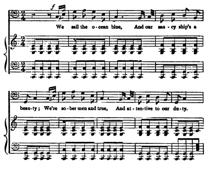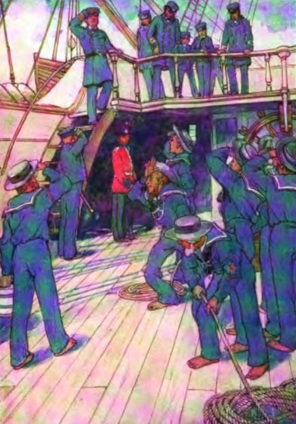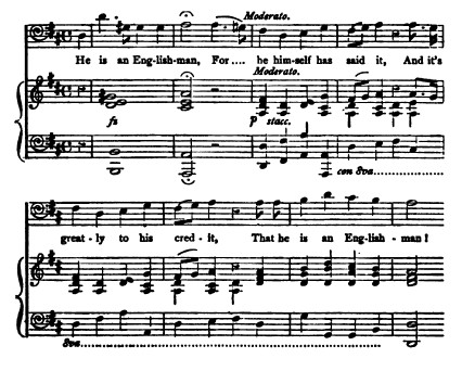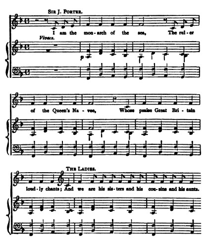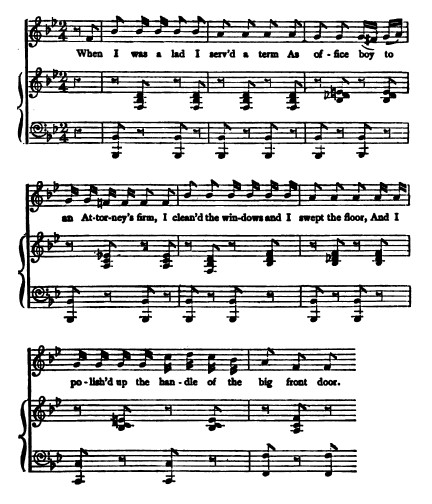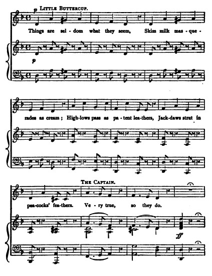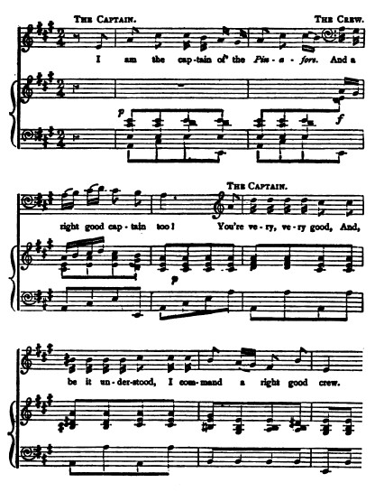 There is a time, between four and six in the afternoon, when the men-of-war sailors are allowed to cease their work and amuse themselves with cheerful songs and rational conversation. It is called the “dog-watch” (why, I can’t imagine), and at that time all who are not engaged upon any special duty meet on the forecastle (which is the front part of the upper deck) to sing pretty songs and tell each other those harmless but surprising anecdotes which are known in the Royal Navy as “yarns.” One of the most popular subjects of conversation during the dog-watch on board the Pinafore was the kindness and consideration shown by their good Captain Corcoran towards the men under his command, and another was the agreeable fact that the Pinafore was one of those jolly ships that never pitched and rolled, and consequently never made any of the sailors sea-sick. The crew, who had been carefully trained by Captain Corcoran to sing more or less in tune, always opened the dog-watch with this chorus: