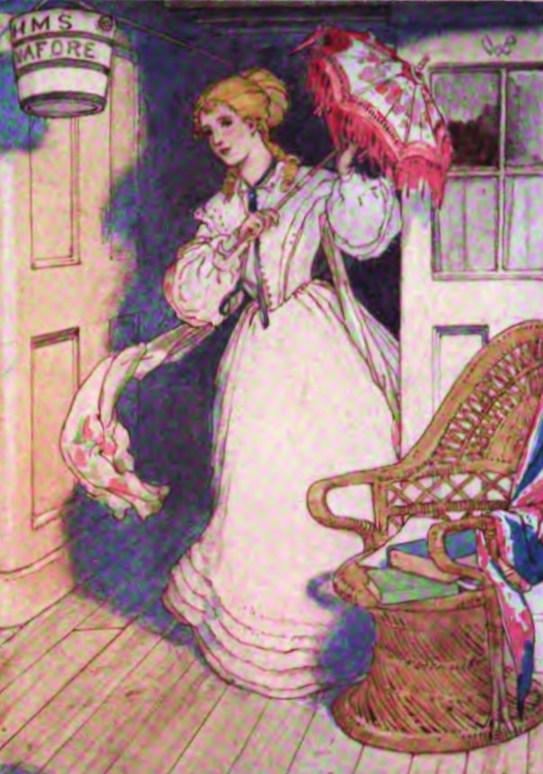 “Thank goodness, that’s over!” whispered the sailors to each other with an air of relief. You see, Little Buttercup always sang that song whenever she came on board, and after a few months people got tired of it. Besides not being really popular on account of her aggravating tongue, she sold for the most part things that the liberal Captain provided freely for his crew out of his own pocket-money. They had soup, fish, an entrée, a joint, an apple pudding, or a jam tart every day, besides eggs and ham for breakfast, muffins for tea, and as many scissors, pocket-knives, and cigars as they chose to ask for. So Little Buttercup was not even useful to them, and they only tolerated her because they were gallant British Tars who couldn’t be rude to a lady if they tried. In point of fact they had tried on several occasions to say rude and unpleasant things to ladies, but as they had invariably failed in the attempt they at last gave it up as hopeless, and determined to be quietly polite under all possible circumstances. So they asked her to sit down, and take a strawberry ice and a wafer, which she did rather sulkily as no one seemed to want any of the things she had to sell.