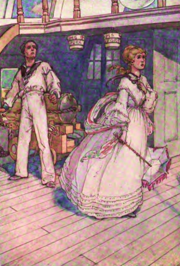 “Tell us a story, Little Buttercup,” said Bill Bobstay. Bill was a boatswain’s mate, who, besides being busily occupied in embroidering his name in red worsted on a canvas “nighty case,” generally took the lead in all the amusements of the dog-watch. “You can if you try, I’m sure, Miss.”