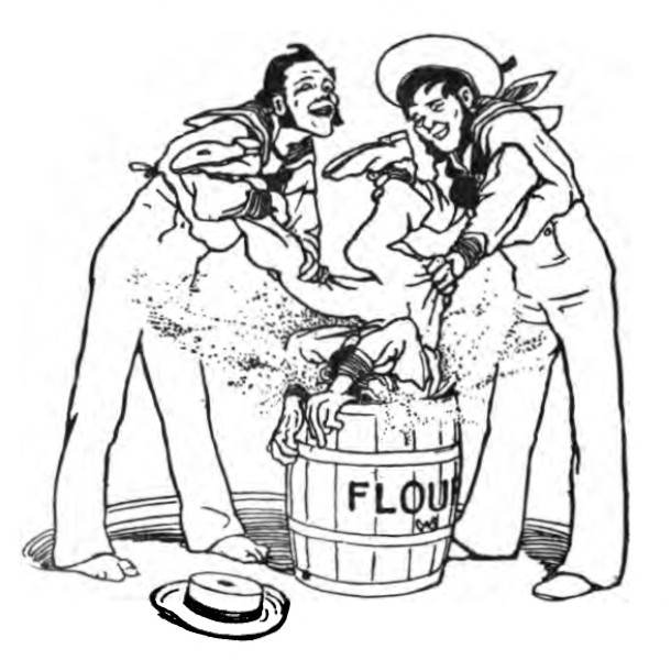 “You’re quite right,” said Little Buttercup; “I could tell you stories about yourselves which would make you all wish you had never been born. I know who takes sugar-plums to bed with him” (looking at one), “and who doesn’t say his prayers” (looking at another), “and who sucks his thumb in his hammock” (looking at the third), “and who makes ugly faces at his Captain when his back’s turned” (looking at a fourth), “and who does his front hair with patent curlers” (looking at a fifth), “and who puts raspberry jam into his messmates’ boots” (looking at a sixth).