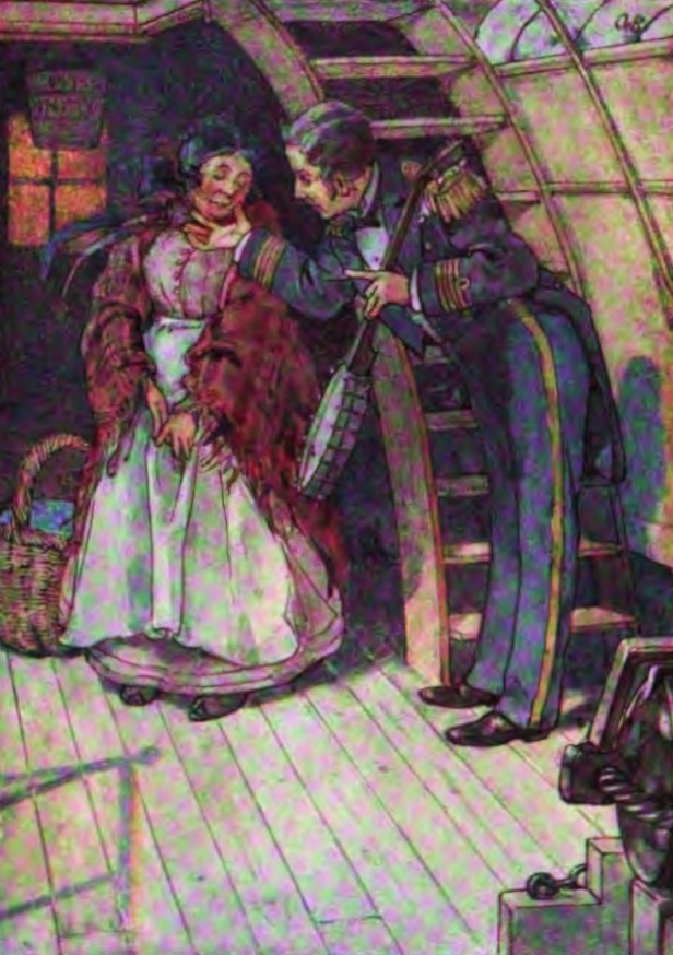 As the sailors sat and talked they were joined by a rather stout but very interesting elderly woman of striking personal appearance. She was what is called a “bum-boat woman,” that is to say, a person who supplied the officers and crew with little luxuries not included in the ship’s bill of fare. Her real name was Poll Pineapple, but the crew nick-named her “Little Buttercup,” partly because it is a pretty name, but principally because she was not at all like a buttercup, or indeed anything else than a stout, quick-tempered, and rather mysterious lady, with a red face and black eyebrows like leeches, and who seemed to know something unpleasant about everybody on board. She had a habit of making quite nice people uncomfortable by hinting things in a vague way, and at the same time with so much meaning (by skilful use of her heavy black eyebrows), that they began to wonder whether they hadn’t done something dreadful, at some time or other, and forgotten all about it. So Little Buttercup was not really popular with the crew, but they were much too kind-hearted to let her know it.