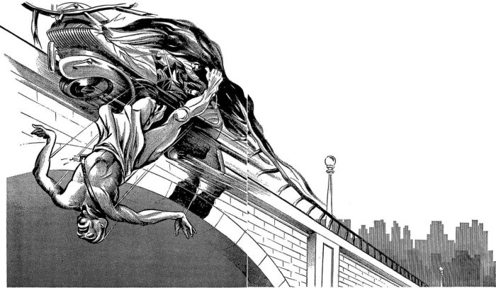 Calman said, “As I figure it out, he must have been creeping along the Pedestrian Gallery above, slipped, and—Wham! Anyway, it’s the man. His ship ought to be somewhere around. I saw him hanging there in the lights from my car while I was heading home. Better have the boys look around for his ship, and we’ll cart him to the morgue and see what sort of a being he really is. Come on.”