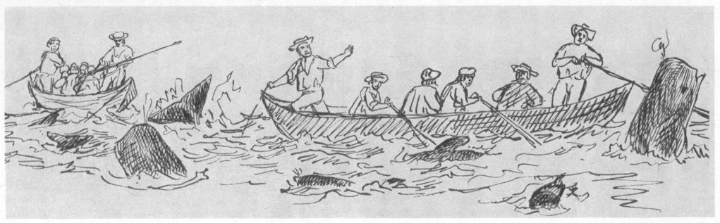 Between the two after thwarts is set a tub in which is spirally coiled in concentric layers the softest of Manila ropes, two-thirds of an inch in thickness, 220 fathoms long. One end of this is to make fast to an eye spliced in the strap that holds the iron to the pole. The other end is left hanging loose over the edge of the tub as a matter of safety, and to fasten a second line on, if needed, from another boat, should the whale sound deep enough to take out the entire length. (I have seen a large sperm whale take out four of these lines, one bent to the other, a mile in length, and this on an up-and-down sound; and get away.)