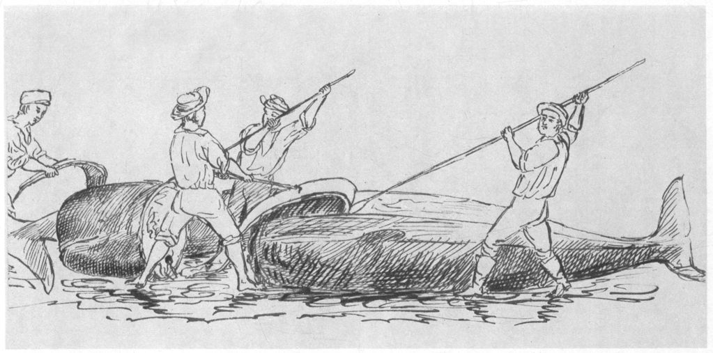 First, though, you have to sight your whale; if not the hulking hump of a solitary bull sperm, then at any rate what Haley is fond of calling “the low bushy spouts” that betray where the herded cetaceans are quietly basking, unaware of eager lookouts with eyes which, although scarcely more powerful than their own, have been sharpened by thought of profits to share and spend on Nantucket or in New Bedford or in Mystic, half a world and perhaps two years or more away. “ ‘T-h-e-r-e s-h-e B-l-o-w-s!’ was the pleasing sound from the masthead”: and it is the keynote of Nelt Haley’s narrative.