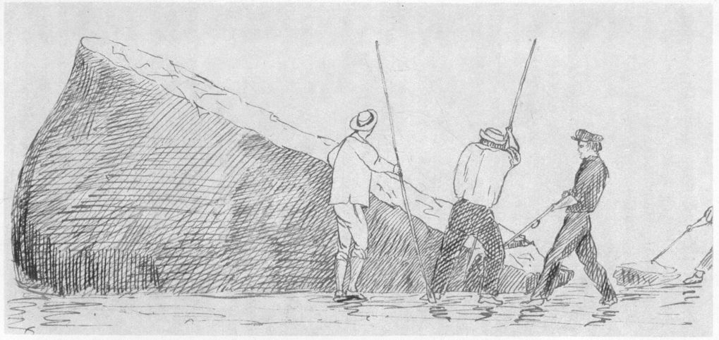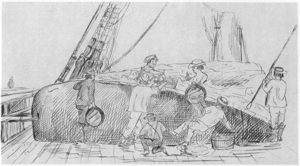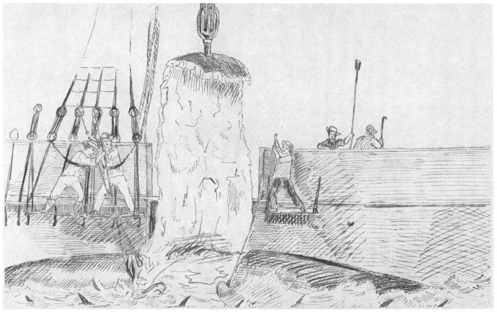 On the 25th day of May, 1853, we hove the ship to and got soundings in sixty-five fathoms of water. We supposed ourselves about fifty miles from Block Island, but as we had had no observations for some days, we could only judge our position by the soundings and dead reckoning. The wind was still from the South and East, the weather thick and rainy, so we kept a bright lookout and steered our course N.N.E. All hands were set at work tearing down the tryworks and throwing overboard the bricks and useless lumber from it. The trypots were turned bottomside up and lashed between the heavy iron knees, bolted to the deck, that hold the tryworks in position. The tryworks are always torn down at the end of each voyage and new ones built for the next.