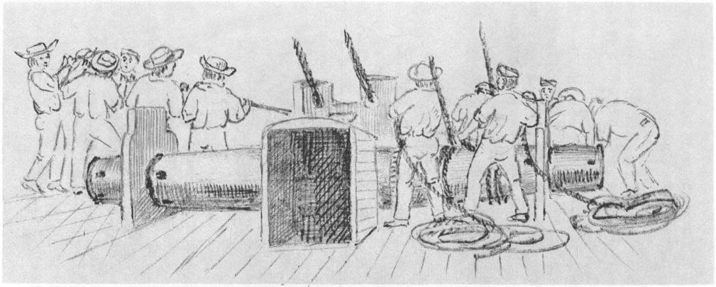 The Mate had hardly given the order to man the windlass before the heavy iron brakes were in place, manned by a dozen stout men on either side, eager for the word, “Heave away!” as race horses are for the word “Go.” Soon the clink of the iron palls could be heard as the windlass spun around from the vigorous strokes of the men, who were raising their bodies and arms on one side to their fullest extent, while the opposite side bent nearly to the deck as the handle through the iron beam of the brakes went up and down. The echoes from this and the songs of “High, Randy, O,” “Mobile Bay,” and “Off She Goes” made the hills around us seem alive with voices and strange noises, and caused many a door and window to open on the shore, no great distance away.