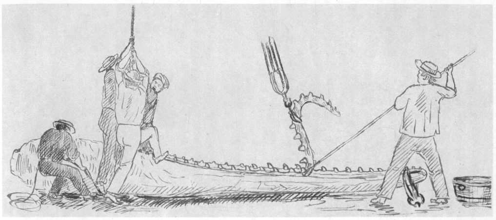 The lips are fast to this lower jaw, coming to a round point at the forward end. The after end of each lip is joined to the body by one corner; otherwise, they are loose, and when feeding these are dropped away from the part of the head that holds the bone, that part being raised with the ends of the slabs of bone sticking out. The lower jaw, when dropped enough to show an opening big enough to drive an ox team in, and he coming quickly towards a person for the first time, a vision of such horror is unfolded to the view that one might wish he had not come whaling. . . .