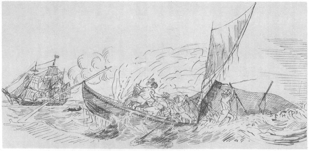 The Captain took a turn back and forth on the quarterdeck. Then, stopping in front of them with a black and ugly look, he told them the ship was rendered liable to the English government in taking away soldiers from a garrison; and here we were some two hundred miles away from port. “To turn the ship back to land you might delay us a week, and be damned to you,” said he.