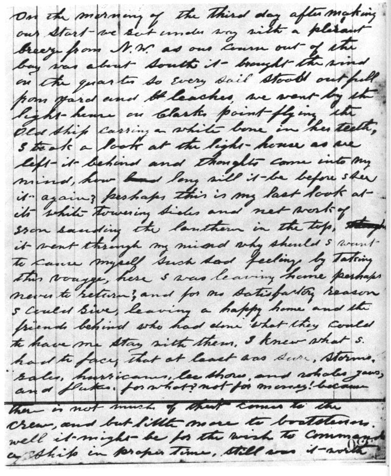 The feeling of pleasure to once more be walking through the streets so familiar, cannot be expressed by me in words now. Many times I had dared not let my thoughts carry me away, as it seemed, when thinking over in the lone watches on deck at night, or swaying back and forth at the topgallant head when on the lookout for whales, that my chances of being killed by a whale or falling from aloft or tumbling overboard were as much for it as against it; and it often had appeared I never would have such pleasure again.