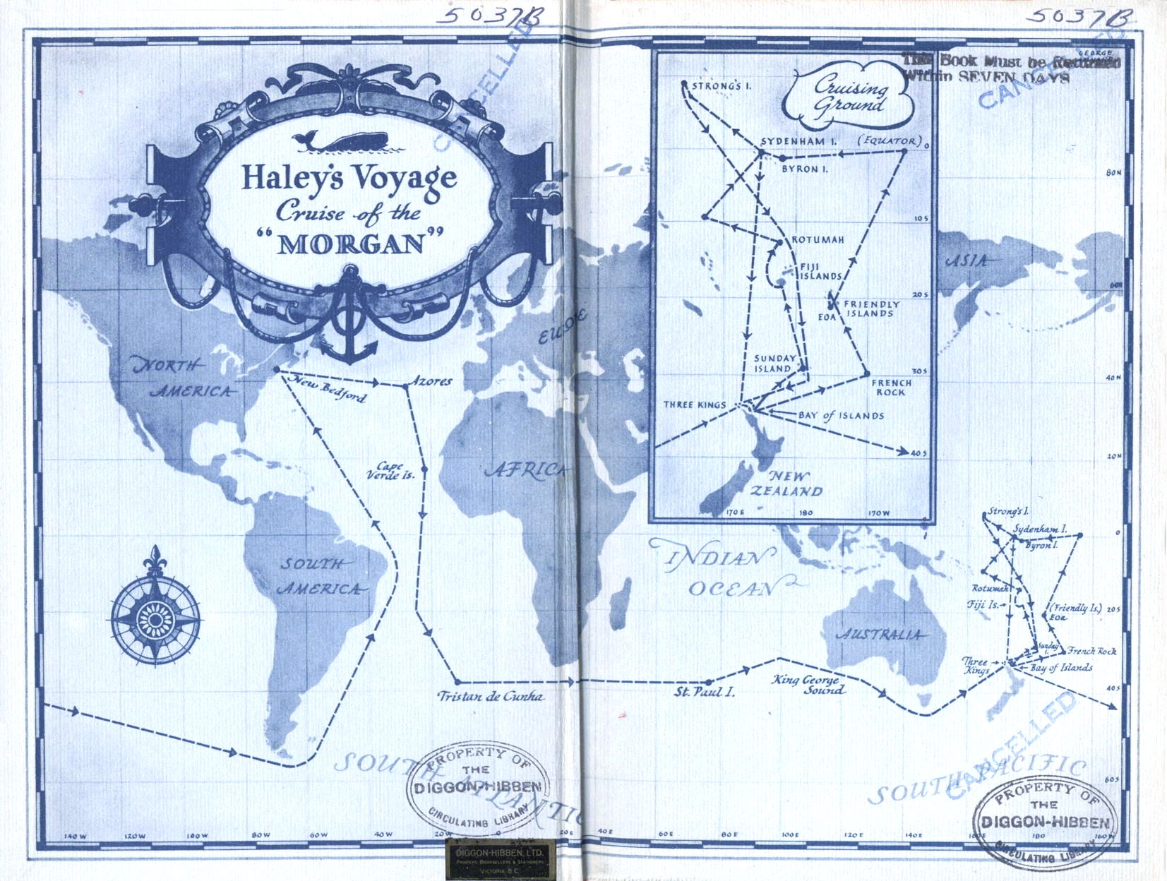 His first cruise ended shortly after his sixteenth birthday. The winter of 1848-49 he spent in school, at his mother’s request; she having meanwhile remarried. But within a few months he was off again, this time in the ship Charles W. Morgan, Capt. John D. Sampson, on the four-year voyage that is the subject of this narrative. Young though Haley was, Captain Sampson evidently had good reason to feel confidence in the lad, for he shipped him on in the responsible capacity of boat-steerer, or bow oarsman of a whaleboat, whose duty it was to dart the irons into the whale. As Haley tells us, he already had been practicing on sharks and dolphins; and after safe passage around the Cape of Good Hope and through the Indian Ocean, he struck his first whale in the South Pacific when he was seventeen.