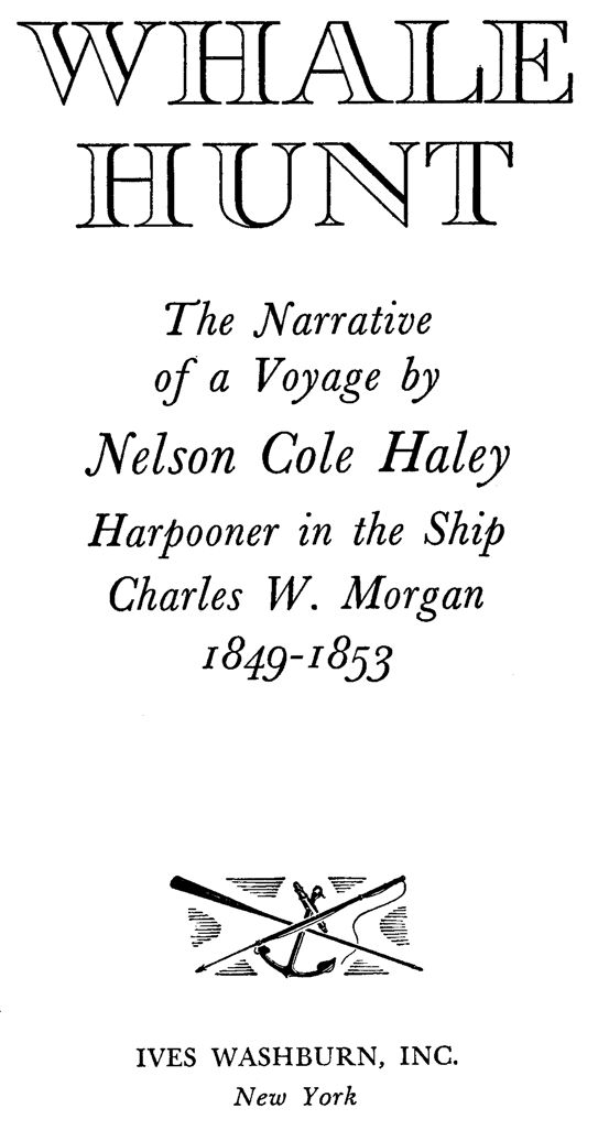 The publishers have made the book ready for press with the valued consultation of Mr. Carl C. Cutler. Period illustrations appearing in it are the work of a foc’sle artist, his name unrecorded, contemporary with Haley, who drew them as decorations for his journal of a whaling cruise in the bark Clara Bell, out of New Bedford in the same decade. Like the narrative itself, they have never before been published. Haley’s original manuscript has been deposited by his heirs in the Marine Museum of the Marine Historical Association, Inc., at Mystic, Connecticut. And at Mystic, too, may be viewed the Charles W. Morgan, still sound in hull and spars.