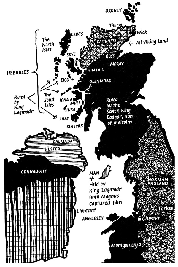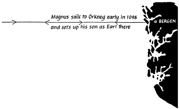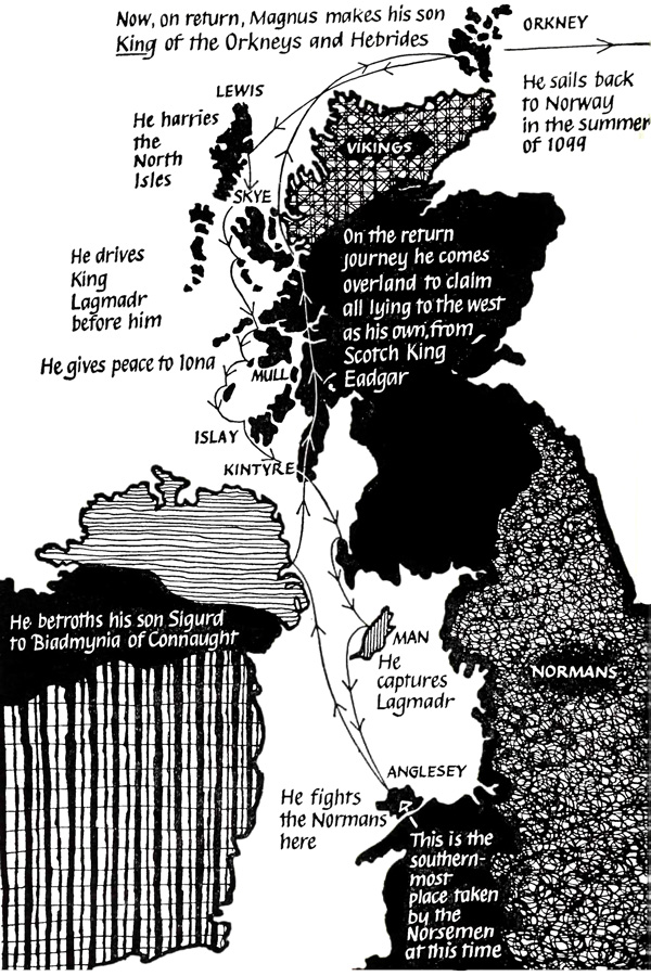 The voyage represents a plain case of a late Viking expedition of aggrandizement—in which King Magnus spends eighteen months acquiring territory and titles on behalf of his young son, Sigurd. In the course of it he terrorizes the independent Orkney Earls, the Hebridean King Lagmadr, the Norman Earls (both named Hugh), conducts a marriage alliance with the Irish King of Connaught, tricks the King of Scotland, makes Sigurd a King—then goes home to Norway.