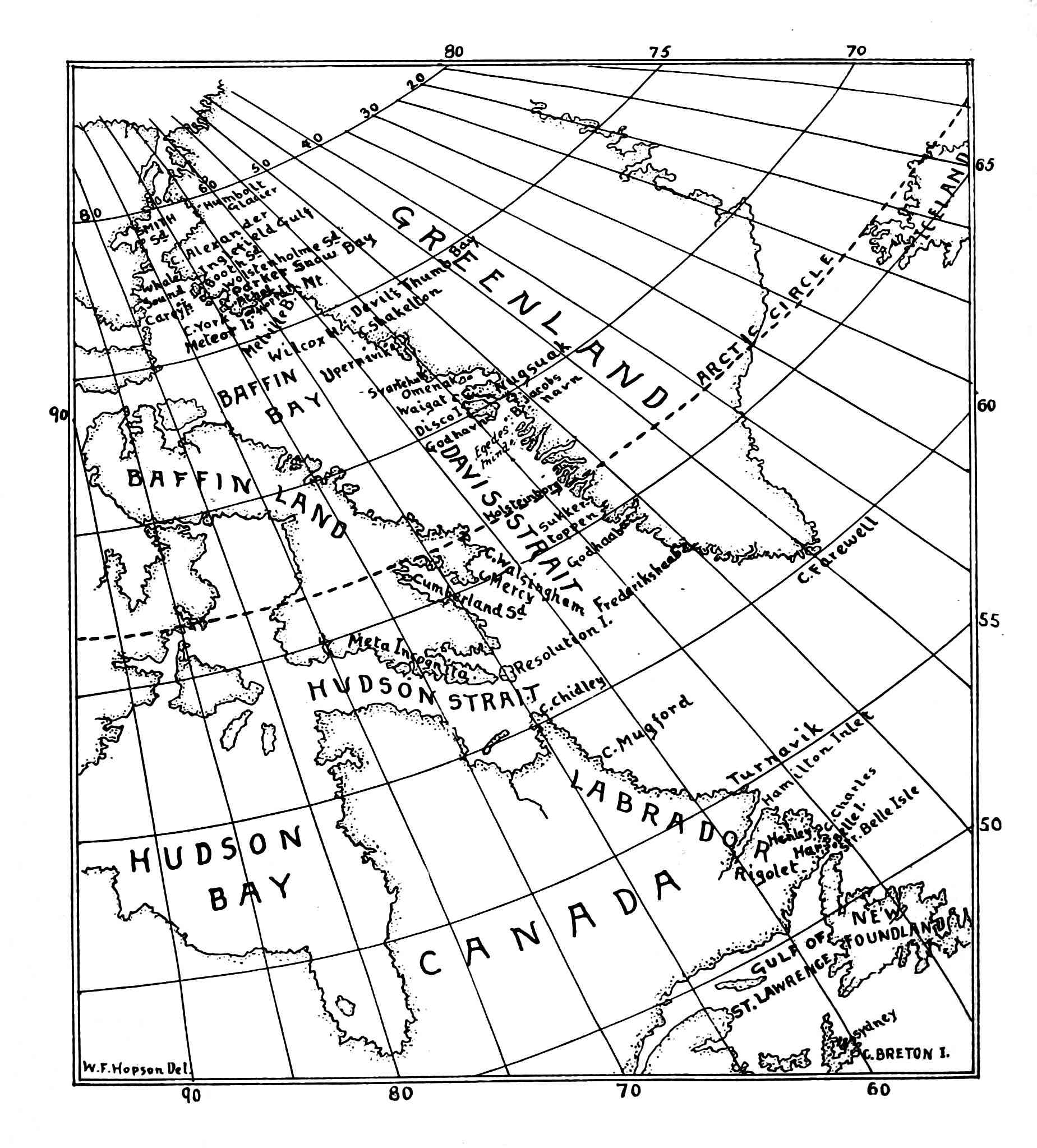Terra Nivea or Meta Incognita lies on the northern side of Hudson Strait. It was probably first visited by the Portuguese or possibly a fisherman, the Portuguese discoveries in this neighborhood dating perhaps about the time of the Cortoreal, after Columbus. Before this there had been interest in navigation and discovery. The Azores had been discovered and added to Portugal. The ideas or maps of a geographer called Pomponius Mela had been studied. The early fisheries of the French may have embraced the banks of Newfoundland. The steamer Arctic was lost near here. The entrance of Hudson Strait is about thirty miles or something more wide in the narrowest part. The shores of Resolution Island rising to the north of the Strait are rather bold—the other shores not quite so high. At Big Island where we came first there was not much ice. Near Big Island there were some eider ducks. The male of the eider duck, the king eider, has a black head and whitish body. The female seemed to be of a color approaching a brownish black. It is said that the male bird separates from the female bird after breeding time, and that the males go in coveys.
