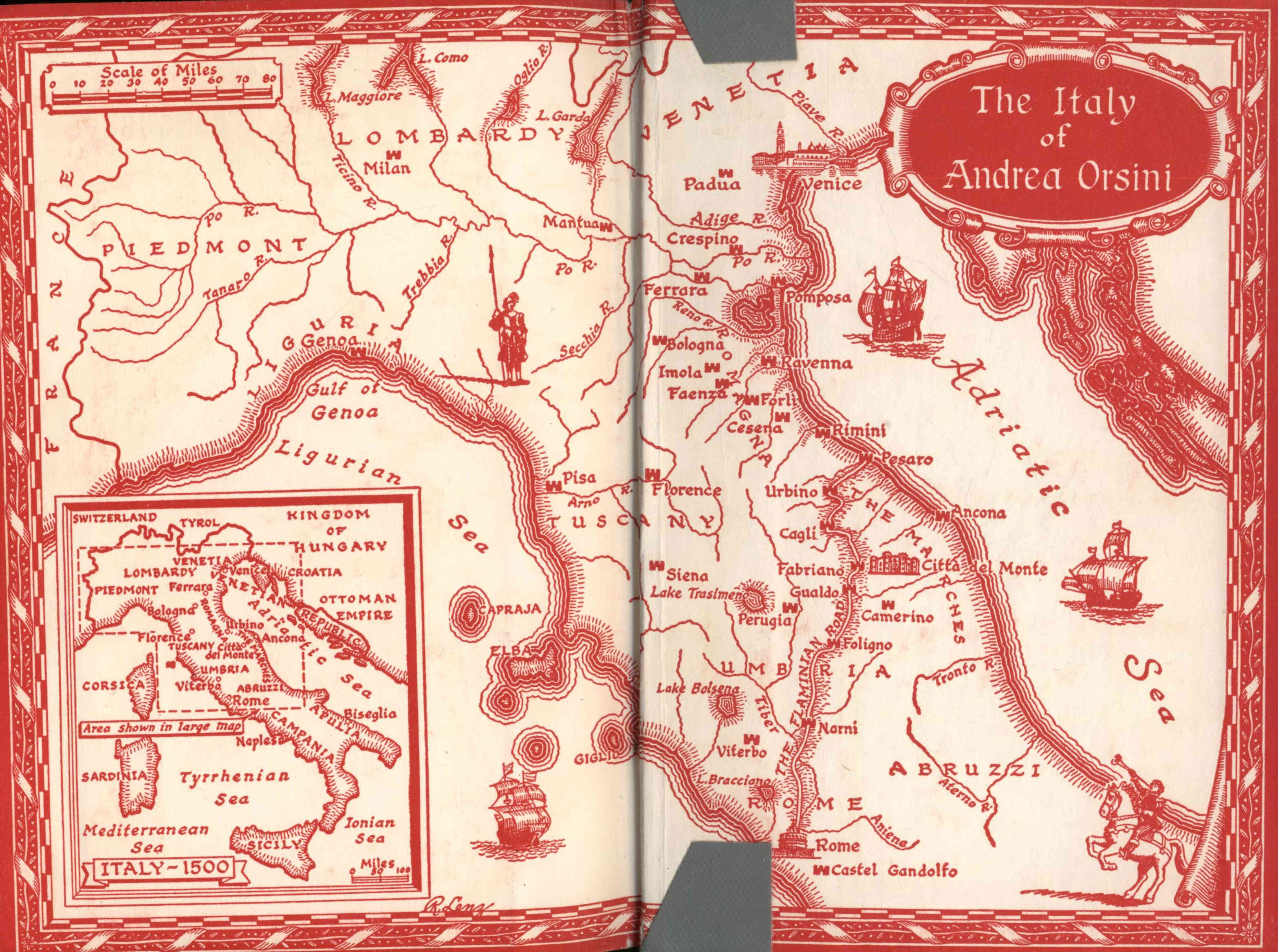 Presently he heard a light tread on the stairs, then a tall figure appeared on the landing. At once Messer Lorenzo felt pleasantly surprised. He had expected brawn, scars and swagger, but he encountered grace and deference. He liked the stranger’s smile, his big mouth and bold, triangular nose. He liked the play of his dark eyes and the abundant vitality in them. The restraint, too, of his dress was pleasing: complete black, except for the tawny collar of marten’s fur on the mantle, a costume that set off vividly the flame of his crimson cap. But, most of all, Messer Lorenzo was struck by an overtone of charm, the supreme quality either in a person or in a work of art, indefinably mysterious. Perhaps Orsini’s young manhood had something to do with it, for he could not have been older than twenty-six.