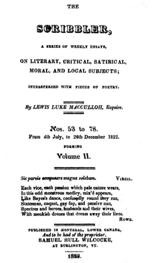 To C. F.  His letter and enclosure came safe to hand. Callum Beg and Junius from Quebec, UN DOCTEUR and Amyntor will appear the first opportunity, and so will Veritas from Chambly, in proper season, but this gentleman, and all my other correspondents are again reminded of that indispensible requisite, a confidential key to their communications. Sam Ginger’s further favours will be acceptable; he will perceive that one of his characters has been omitted, for which there is a reason: from the tenor of his letter I am inclined to think he could furnish me with a specimen of local description etc. as suggested in No. 53. The substance of the communications from Vis et vim, the Devil, and my new correspondent from Ste Marie Nouvelle Beauce, (the continuance of whose occasional letters I shall be pleased with,) will equally be inserted. Old Cuffee, Alden, and several others in next Domestic Intelligencer; so also, if not in some other shape, part of Observator’s Quebec advertisements. Another communication under the same signature, probably from the same gentleman, I am very sorry does not come within the present plan of the Scribbler, as I wish to avoid all discussion that is merely political. I the more regret it, coinciding, as I do, in the sentiments of Observator, and admiring both the manner in which he writes, and the freedom with which he expresses his opinions. Altho’, in pursuance of the system I have adopted, I exclude such subjects at present; yet, having been given to understand that attempts are made to destroy the liberty of the public press in Quebec,[B] I do not know, but I may consider it worth while, if I am encouraged so to do, to set on foot a purely political weekly half sheet, open to all parties, and biassed by none, in which, being no politician myself, I shall obtrude very few of my own sentiments, wishing it principally to be considered as a vehicle for giving publicity to those of others. I respectfully solicit the opinions of my friends as to the feasibility of such a plan, and the degree of encouragement it is likely to receive in Quebec and Montreal.