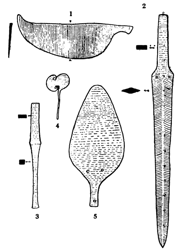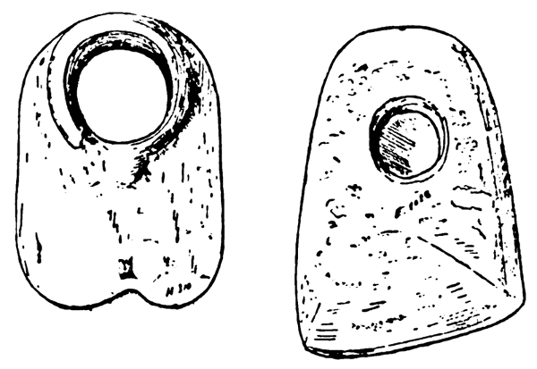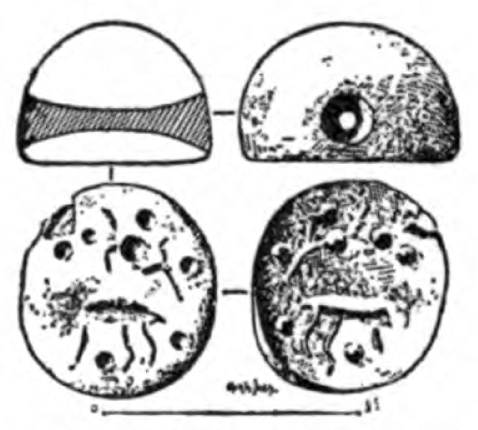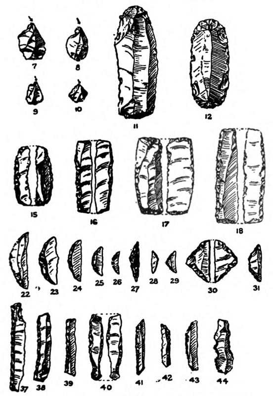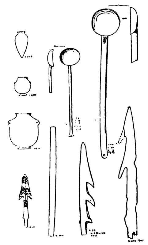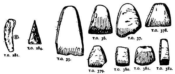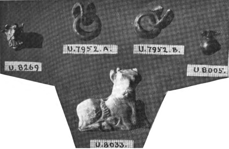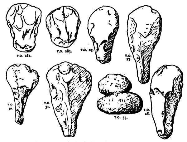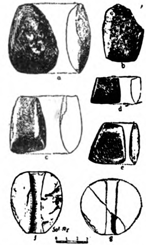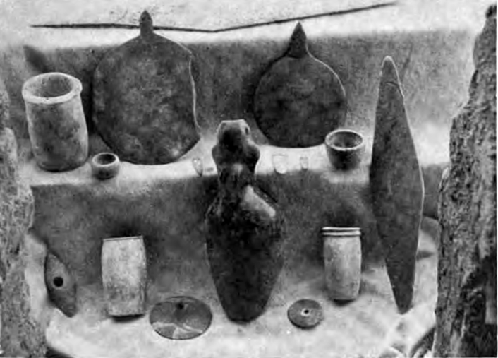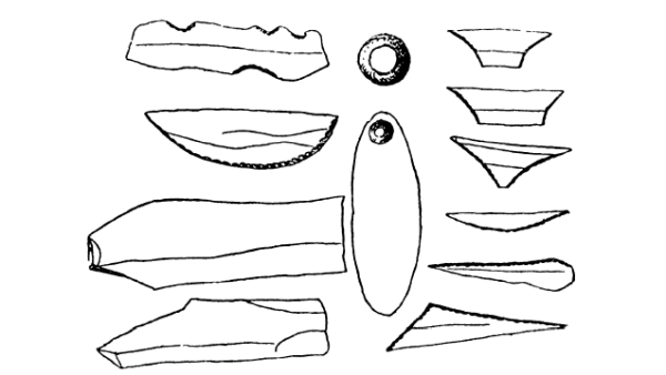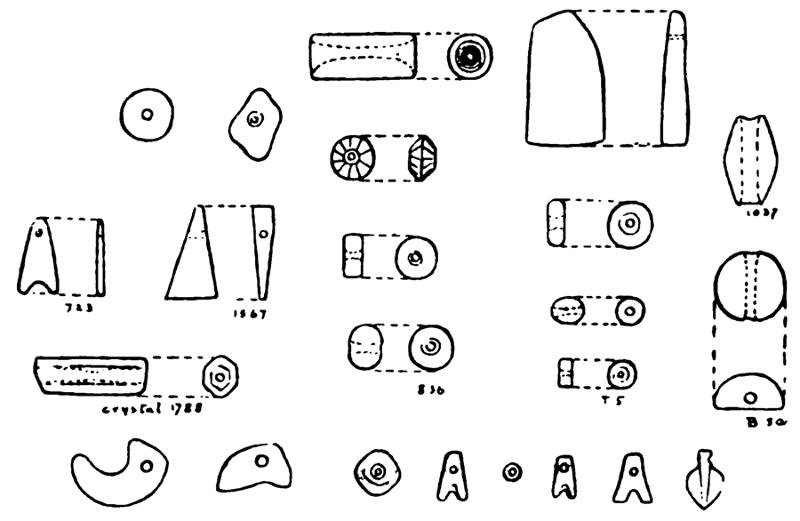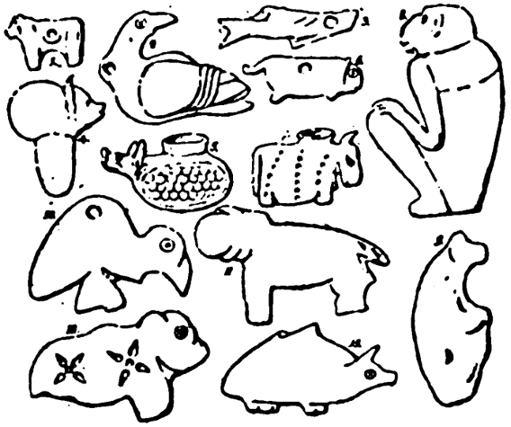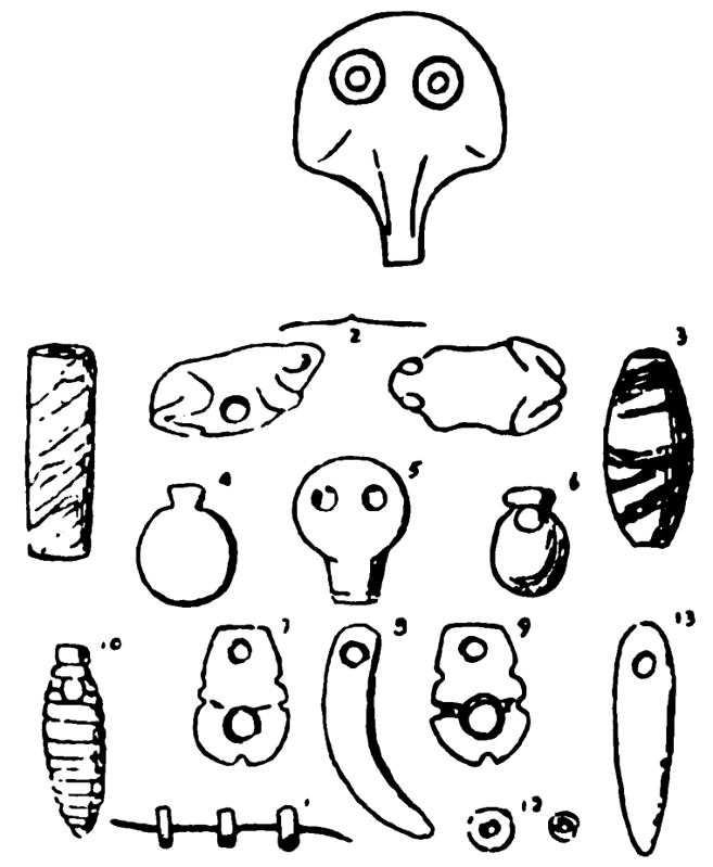 (a) (Top) Slate pendants and theriomorphic palette; (below) clay models, tags, flint saw and fish-tailed blade.