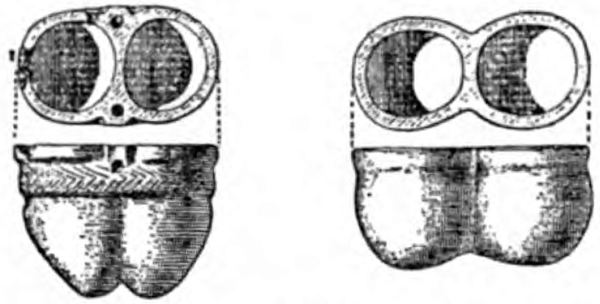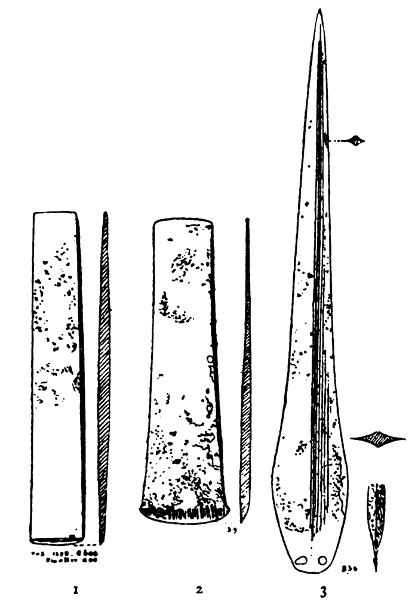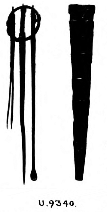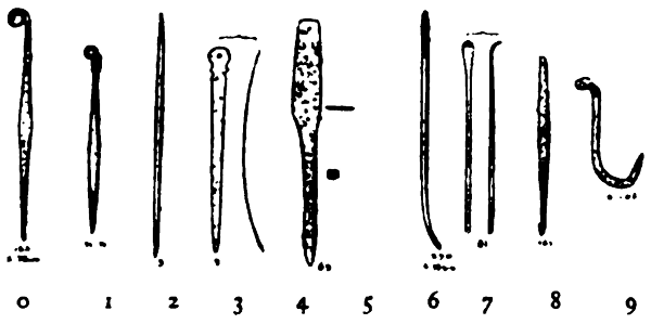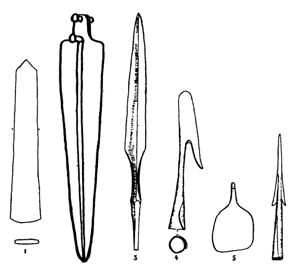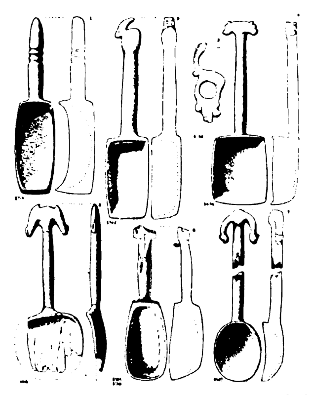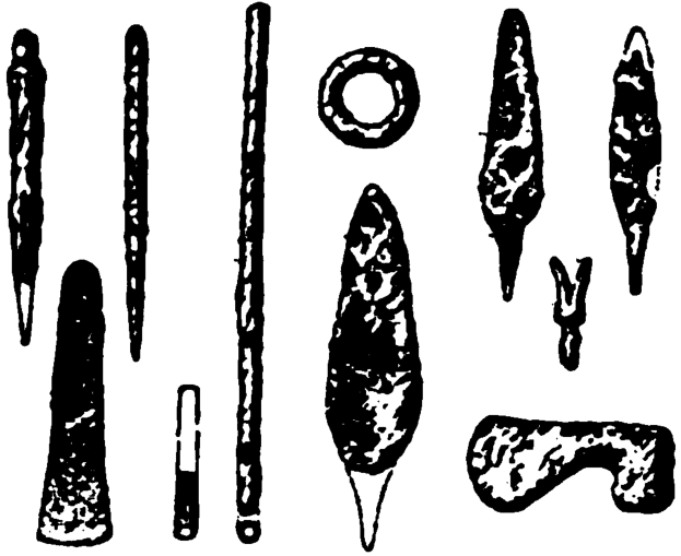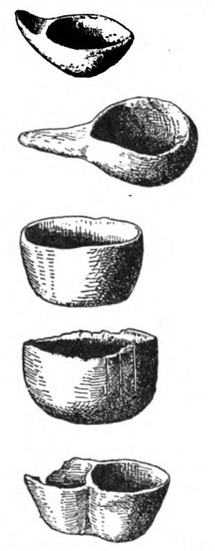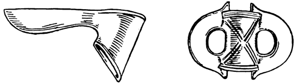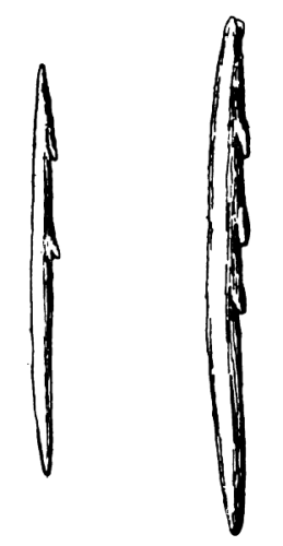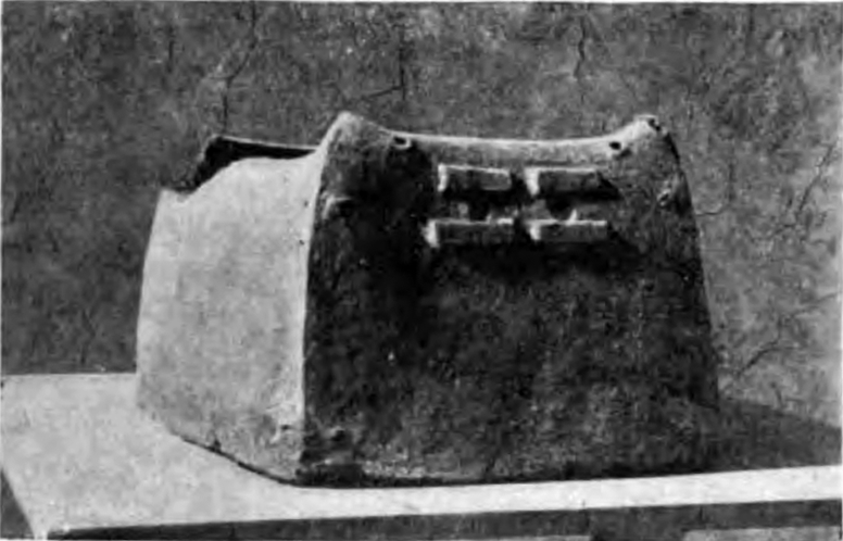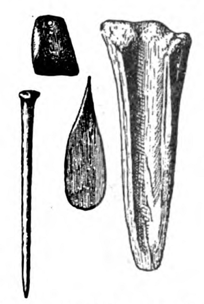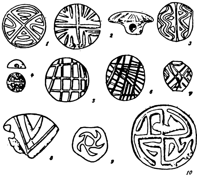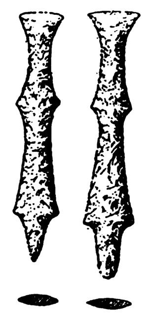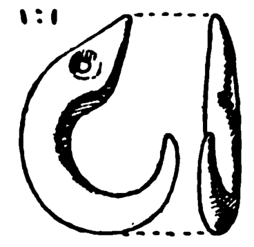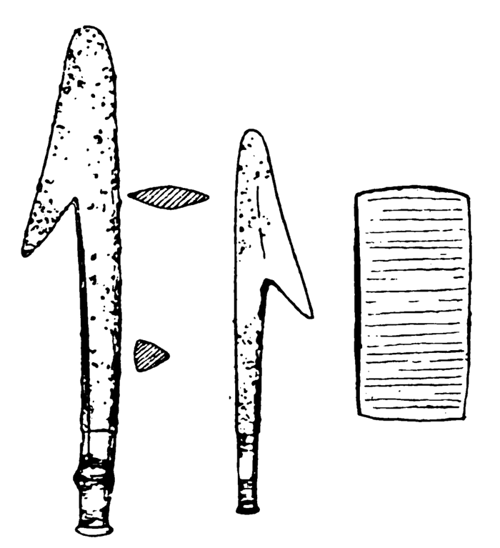 (a) (Top) Slate pendants and theriomorphic palette; (below) clay models, tags, flint saw and fish-tailed blade.