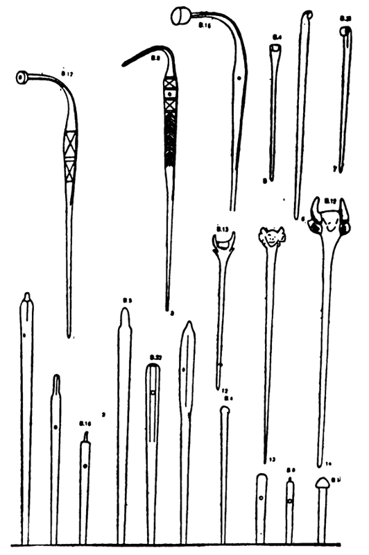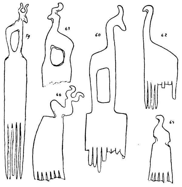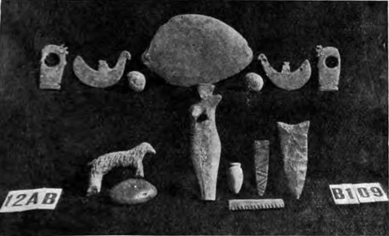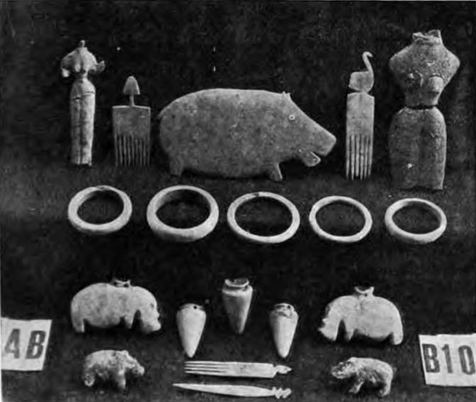 (b) (Top) Figurines, combs and theriomorphic palette; (middle), bracelets; (bottom), amulets, tags, and combs.