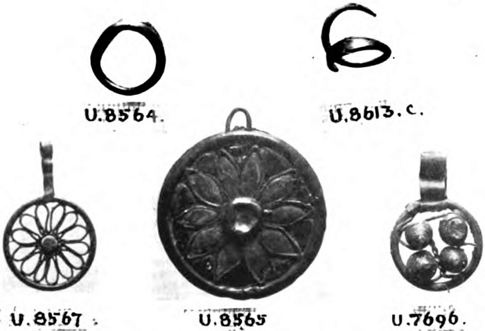 (b) Ear-rings and pendants from graves at Ur. British Museum.