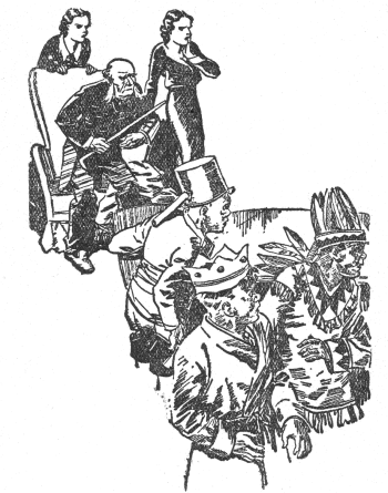 Robert could do nothing but murmur acquiescence. He handed over the tablecloth and cardboard crown and put on his own robe and crown in return. Obviously, however, the Member and his wife, unlike William, considered the possibilities of the situation to be exhausted and were already turning away, though William was just beginning to tell them his age again, when a girl came up and joined them.
