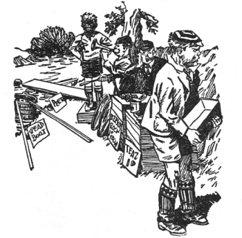 In order to reach the Browns’ house, each suitor must cross a safe but narrow bridge, spanning a lake that had originally been a quarry but was now disused and full of water. William stood on the bridge with a hat of Ethel’s concealed beneath his coat. He stood at a point from which he could see the field path by which the suitor—or suitors—must come. And suddenly he saw them striding along in silence, side by side, neck to neck, their faces stern and grim. Each had set out immediately on receiving the note. They had met on the way without greeting and, without resorting to the indignity of running, each was trying to outpace the other. A rotten test, thought William, watching them dispassionately.