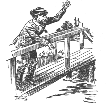 Suddenly with a quick movement of his arm he threw Ethel’s hat down from the bridge into the water, then stood there waving his arms wildly and shouting “Help!” to the oncoming youths. They quickened their pace to a run. “Hi!” shouted William, pointing to the hat, “Ethel’s fallen into the lake.”