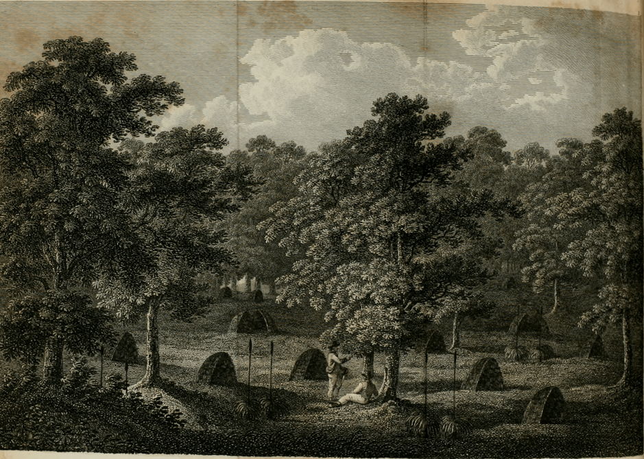 For this purpose, attended by two armed boats, and a guard of seven marines, I landed, accompanied by Mr. Mudge, Mr. Whidbey, and Mr. Menzies. Our boats remained perfectly quiet on the beach, having passed to the shore between some rocks, which completely protected it from the surf. The natives, who were present, received us in a very orderly manner. Two bustling men with large sticks, kept the few spectators at a respectful distance; to these I made some presents; and, on inquiring for water, they directed us to some stagnant brackish ponds near the beach. This being rejected, we were given to understand that good water was to be had in abundance at some distance, to which they readily undertook to conduit us: and as they all appeared friendly and pacific, the boats were left in charge of Mr. Swaine and Mr. Manby; and we proceeded, with our guard, in search of the promised supply. Our guides led us to the northward through the village, to an exceedingly well-made causeway, about twelve feet broad, with a ditch on each side.