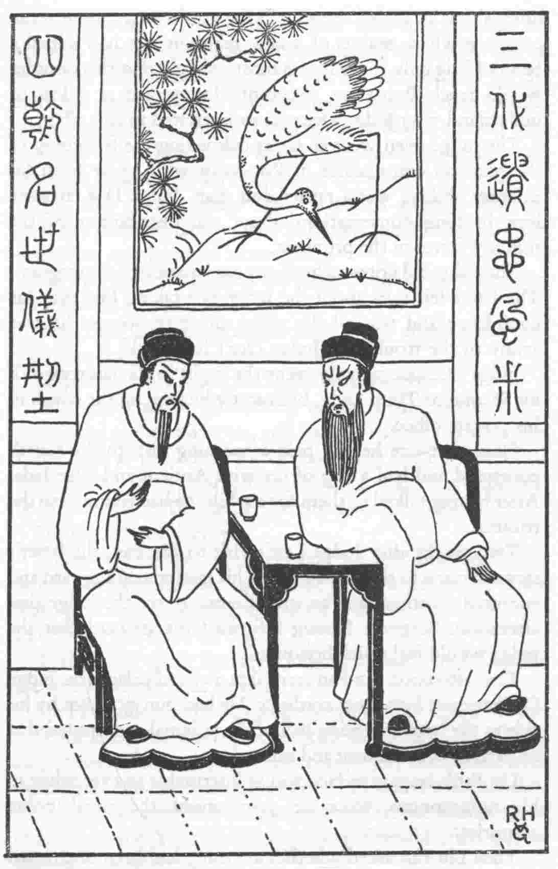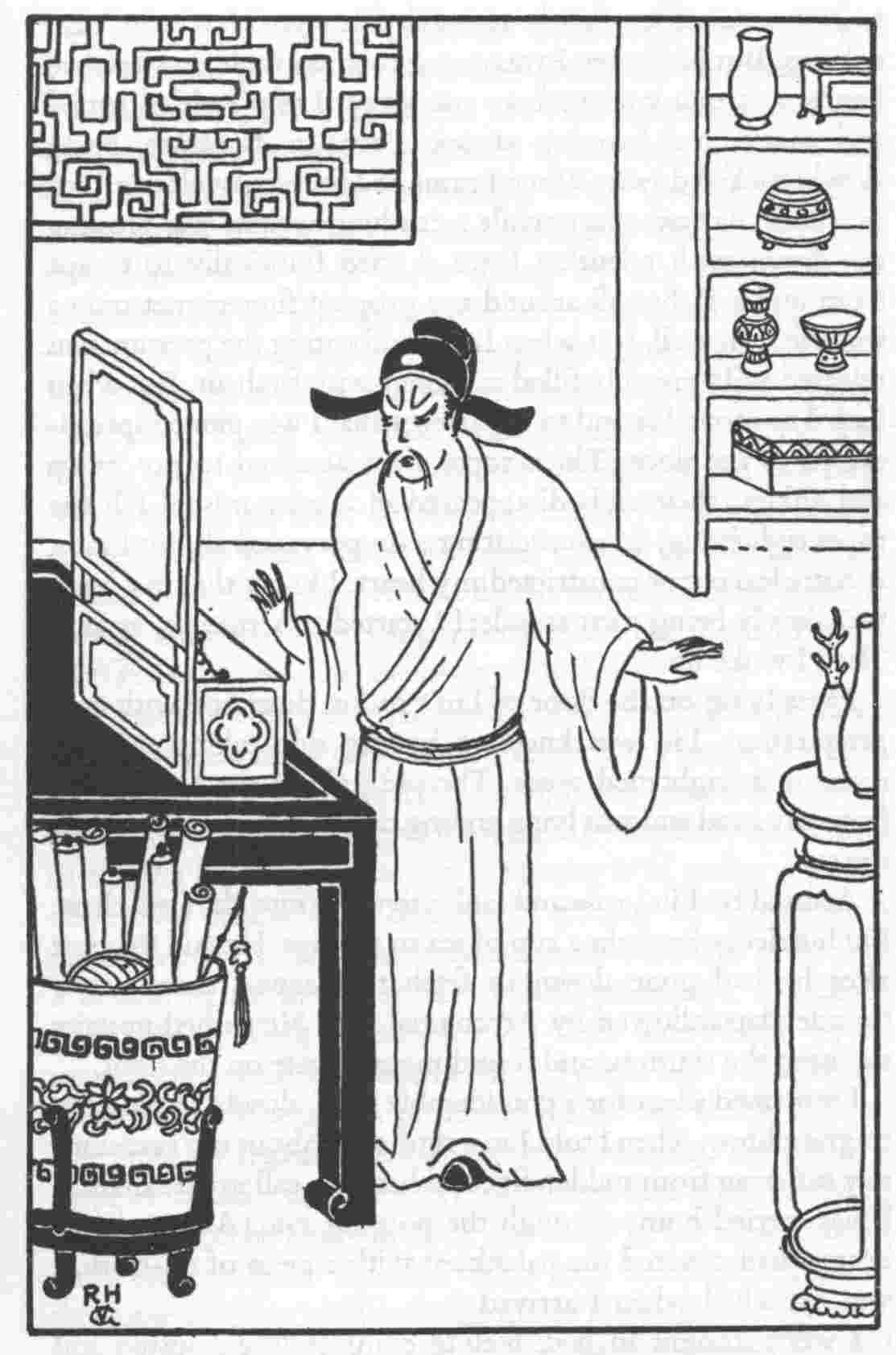 I found Liu there in a surly temper, complaining of a headache. He had closed the shutters in an attempt to keep out the stifling heat. In this semi-darkness the familiar room seemed strange and hostile to me, I thought of leaving then and there. But remembering the heat outside, I decided that I had better tarry awhile and have Liu show me a few things. Thus I sat down in the large arm-chair, vigorously fanning myself with my fan of crane-feathers.