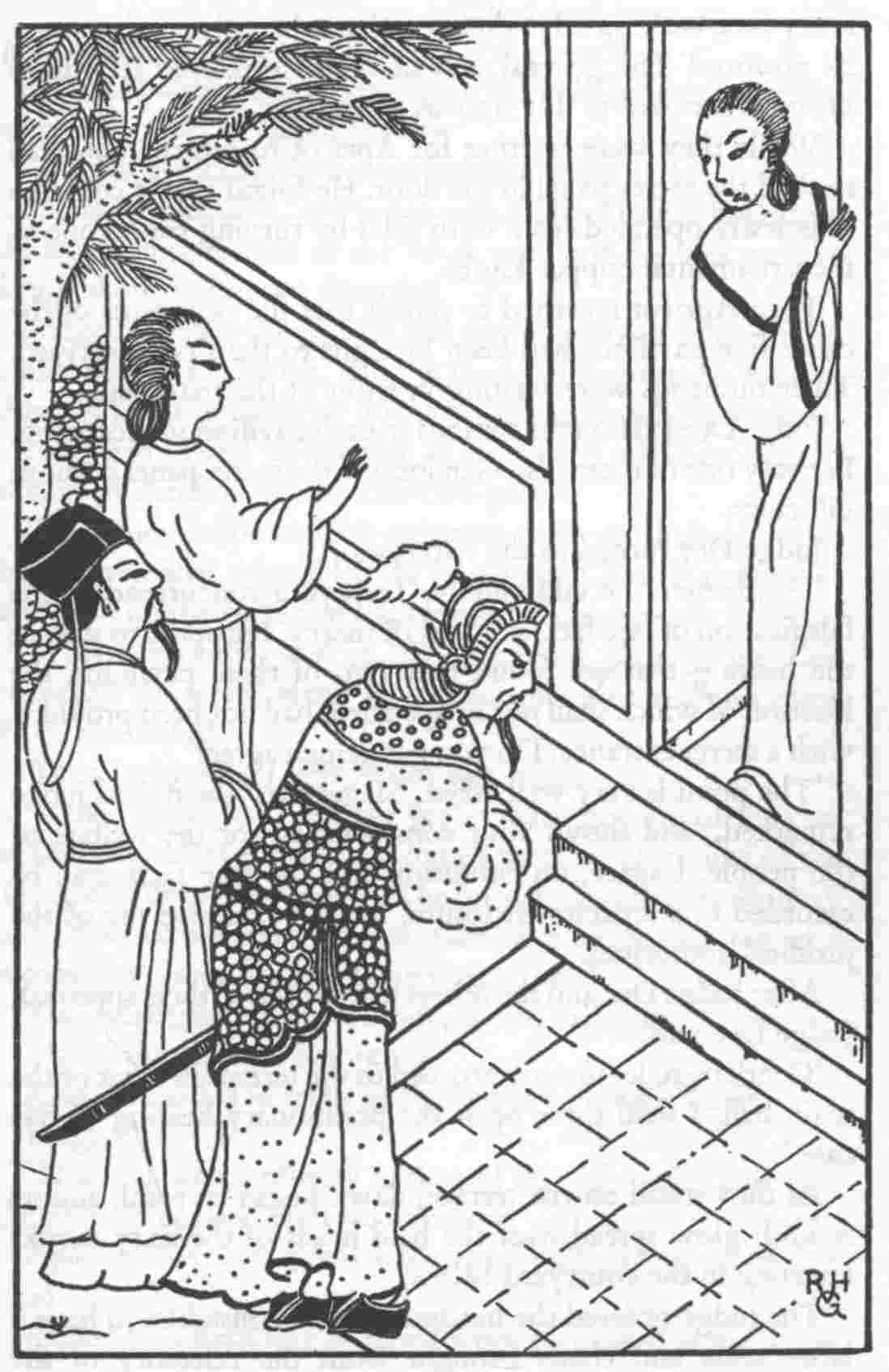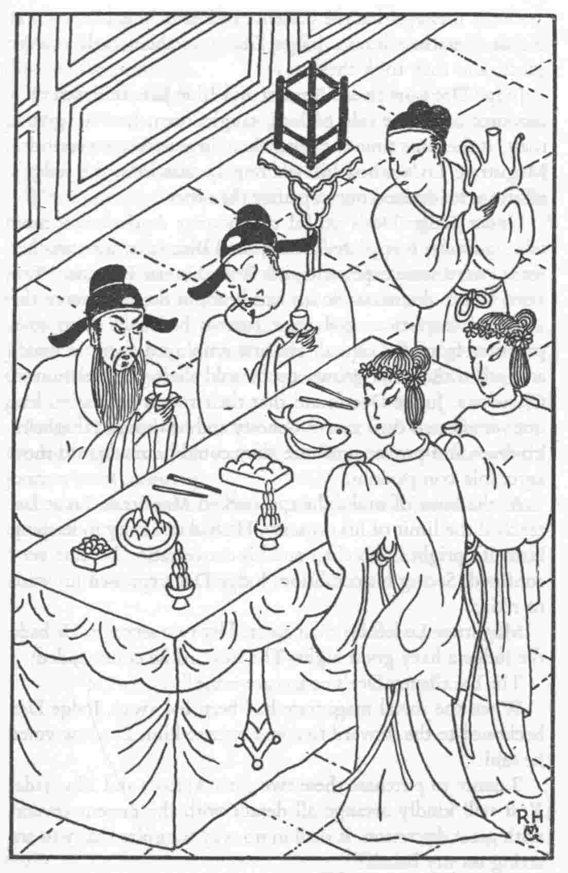 I have adopted the custom of Chinese Ming writers to describe in their novels men and life as during the sixteenth century, although the scene of their stories is often laid several centuries earlier. The same applies to the illustrations, which reproduce customs and costumes of the Ming period rather than those of the T’ang dynasty. Note that at that time the Chinese did not smoke, neither tobacco nor opium, and did not wear the pigtail—which was imposed on them only after a.d. 1644 by the Manchu conquerors. The men wore their hair long and done up in a topknot. Both outdoors and inside the house they wore caps.