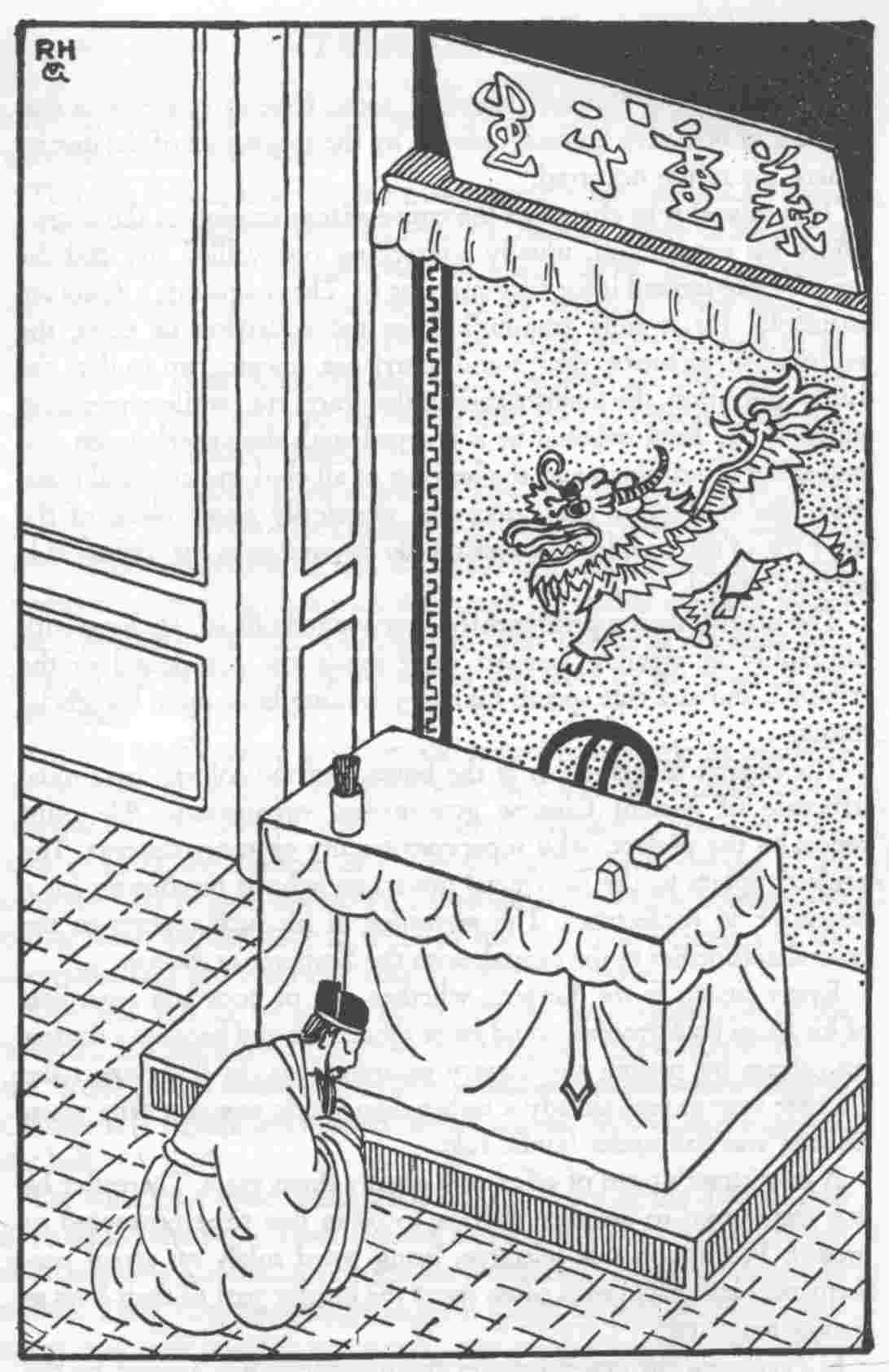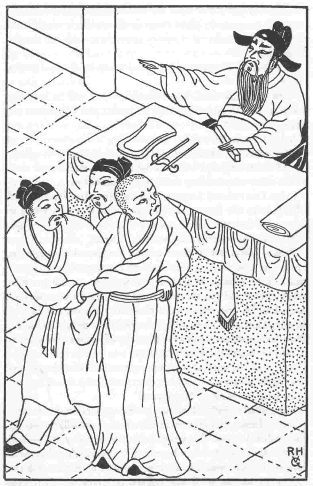 The present novel gives a general idea of ancient Chinese court procedure. The illustrations facing p. 50 and 280 show the arrangement of the court hall. When the court is in session, the judge sits behind the bench, with his assistants and the scribes standing by his side. The bench is a high table covered with a piece of red cloth that hangs down in front from the top of the table to the floor of the raised dais.
