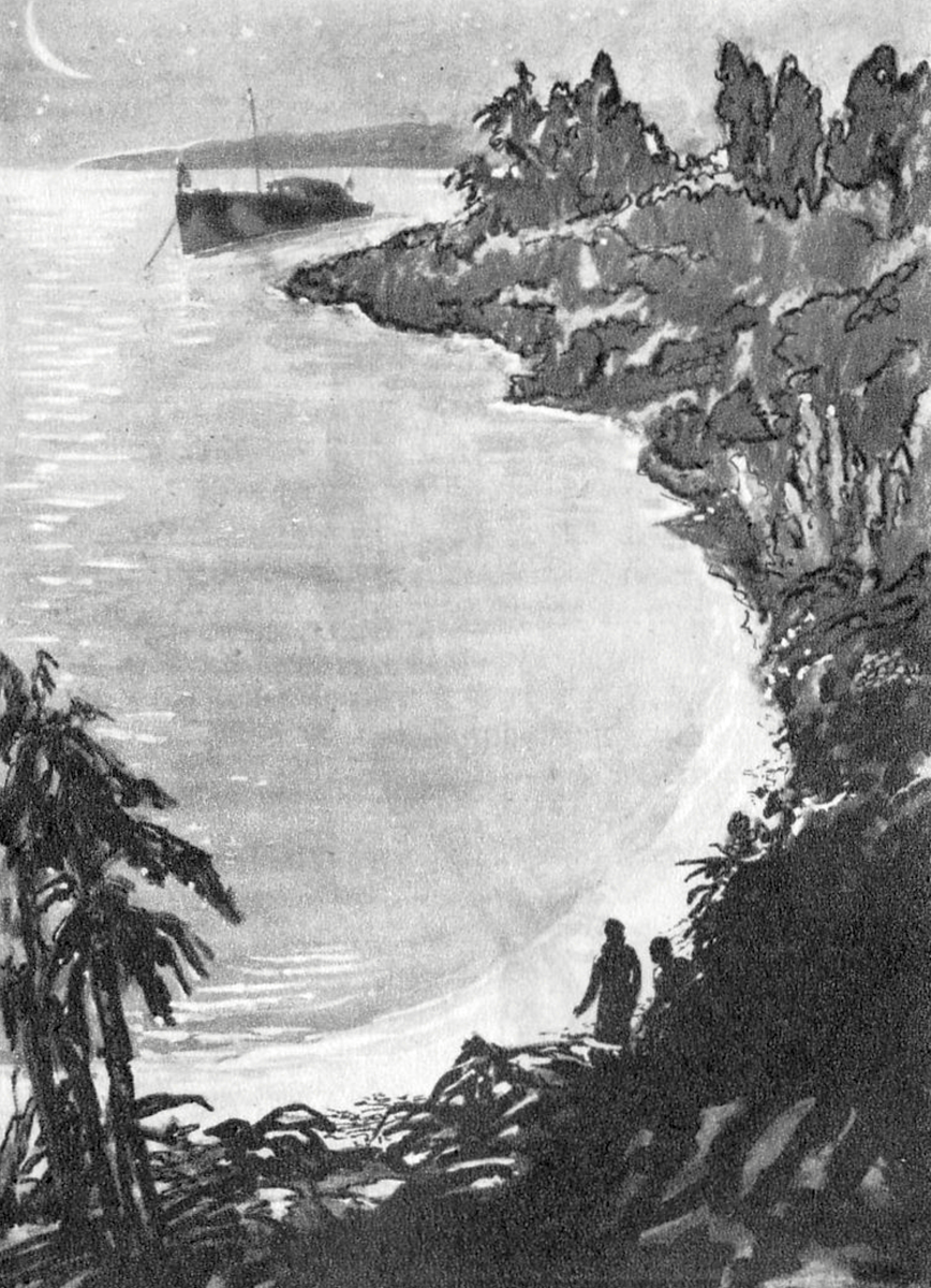 | In a few minutes the canoe, freshly provisioned, was moving at a steady pace through the blue water. (p. 93) | 97 | |