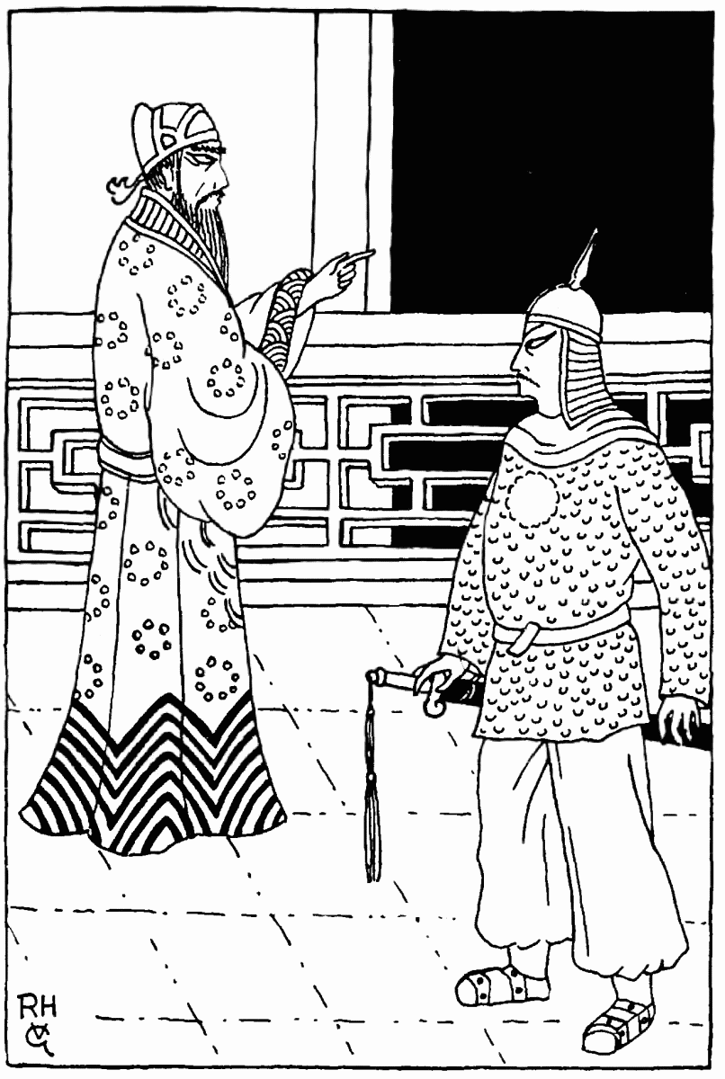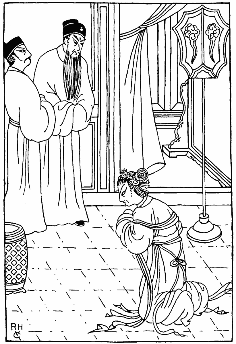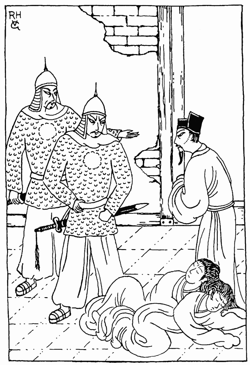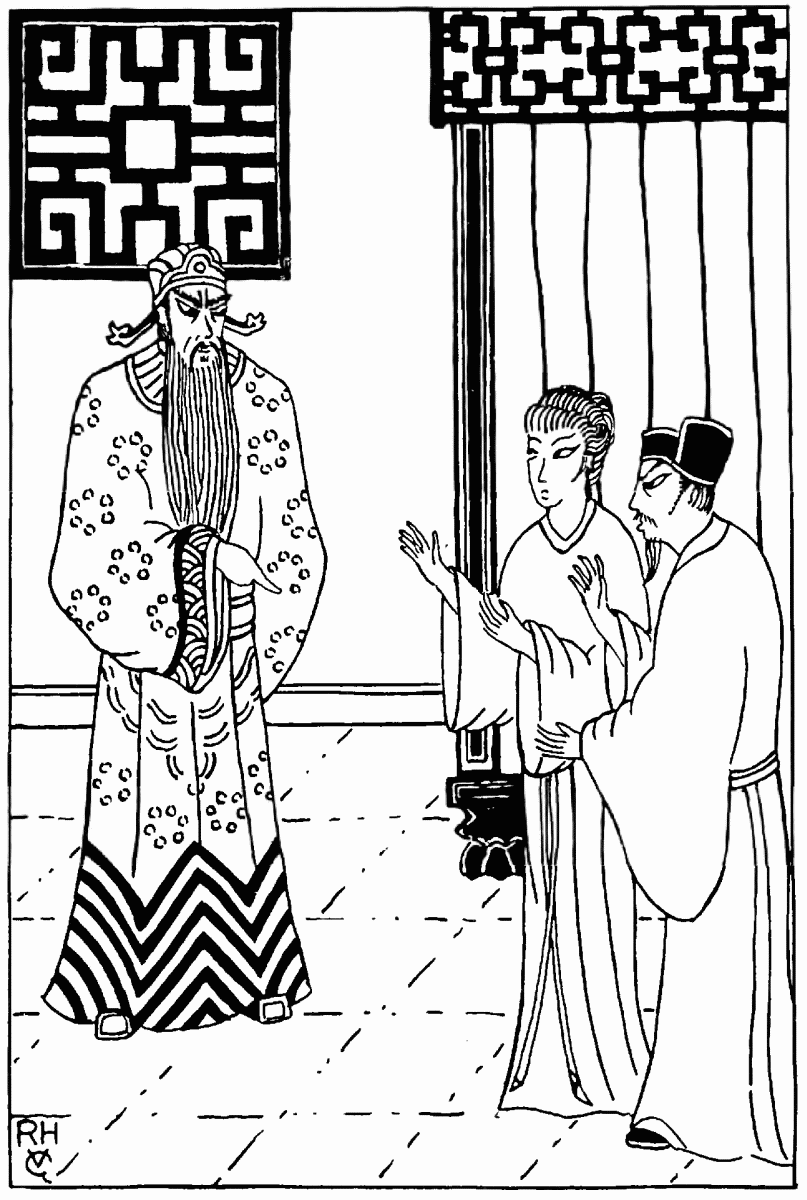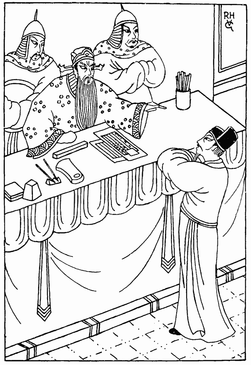 He sat down again, took up his writing-brush and filled in the official form. Having impressed his seal on it, he turned round in his chair and handed it to Chiao Tai. ‘You, Colonel, will immediately take the necessary measures, together with Colonel Ma. Tao Gan shall witness the{169} execution on my behalf, and draw up the official report.’ He rapped his gavel.