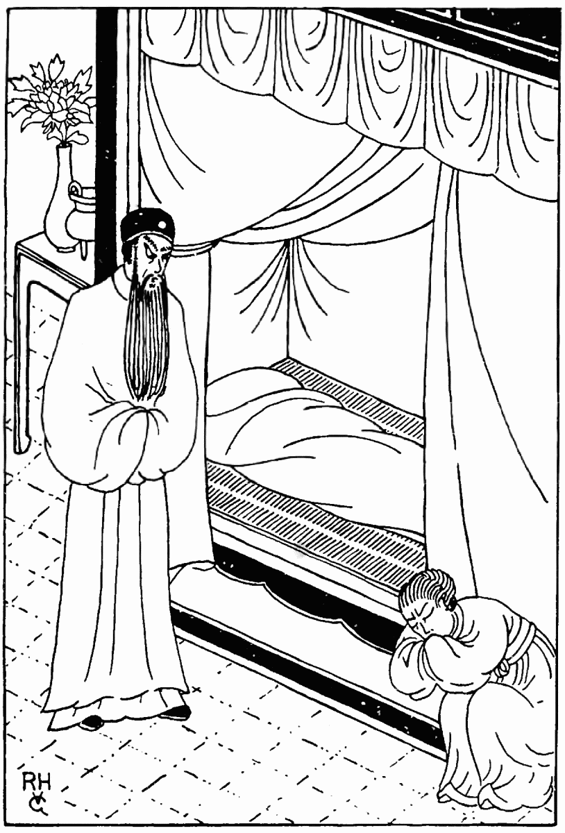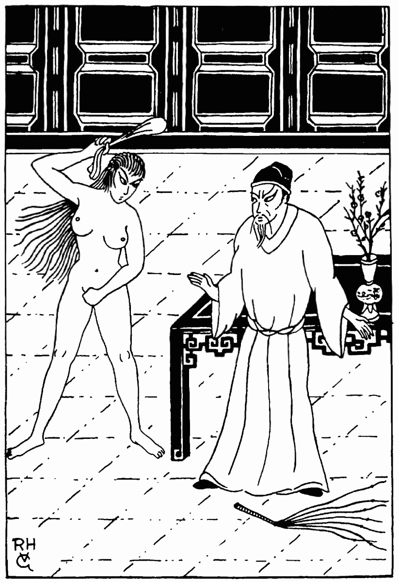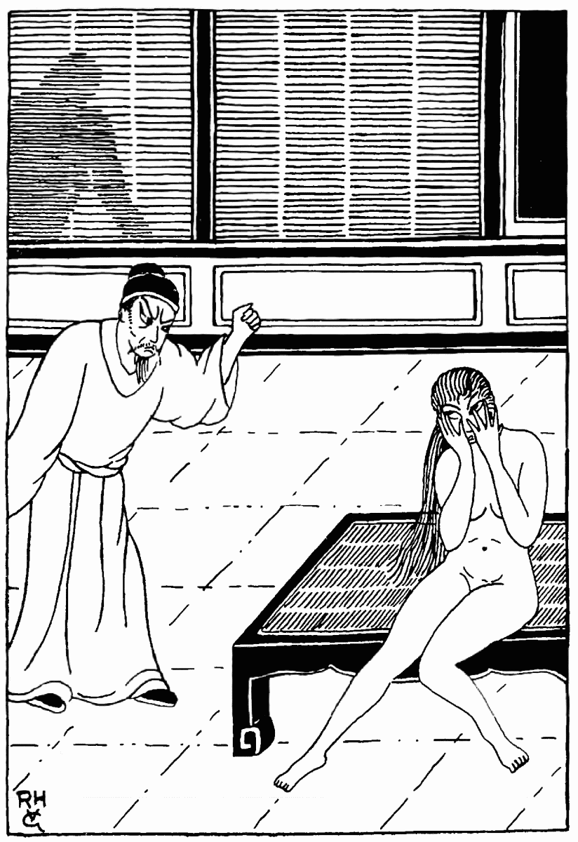 ‘What happened, you say? She had told me to come towards midnight. To the guest-room, as usual. Old Mei had gone up to sleep long before, she said. We had left the bed-curtains drawn back, the only light came from the candle on her dressing-table. Suddenly the moon door opened, and old Mei came inside. He was dressed in his houserobe, his tousled grey head bare. “Kill him!” she told me. “I can’t stand the sight of him. Not any longer!” I got up, but old Mei shook his head. “You needn’t kill me, Hoo,” he said. “Take her away with you. You bought her, she belongs rightfully to you.” She jumped up and went to revile him, but he raised his hand. “I know that you have been unhappy here,” he said, “and your going away with Hoo is your last chance. Perhaps you’ll find what you are looking for, at last.” Shaking his head, he added with that sanctimonious air of his: “If you knew how I pity you!” Those words cut me to the quick. He forgive her? Only I had the right to forgive her! In a blind rage I grabbed the ink-slab, struck him down and kicked that miserable thin body of his about. I stopped only when she put her arms round me, and told me to desist.’