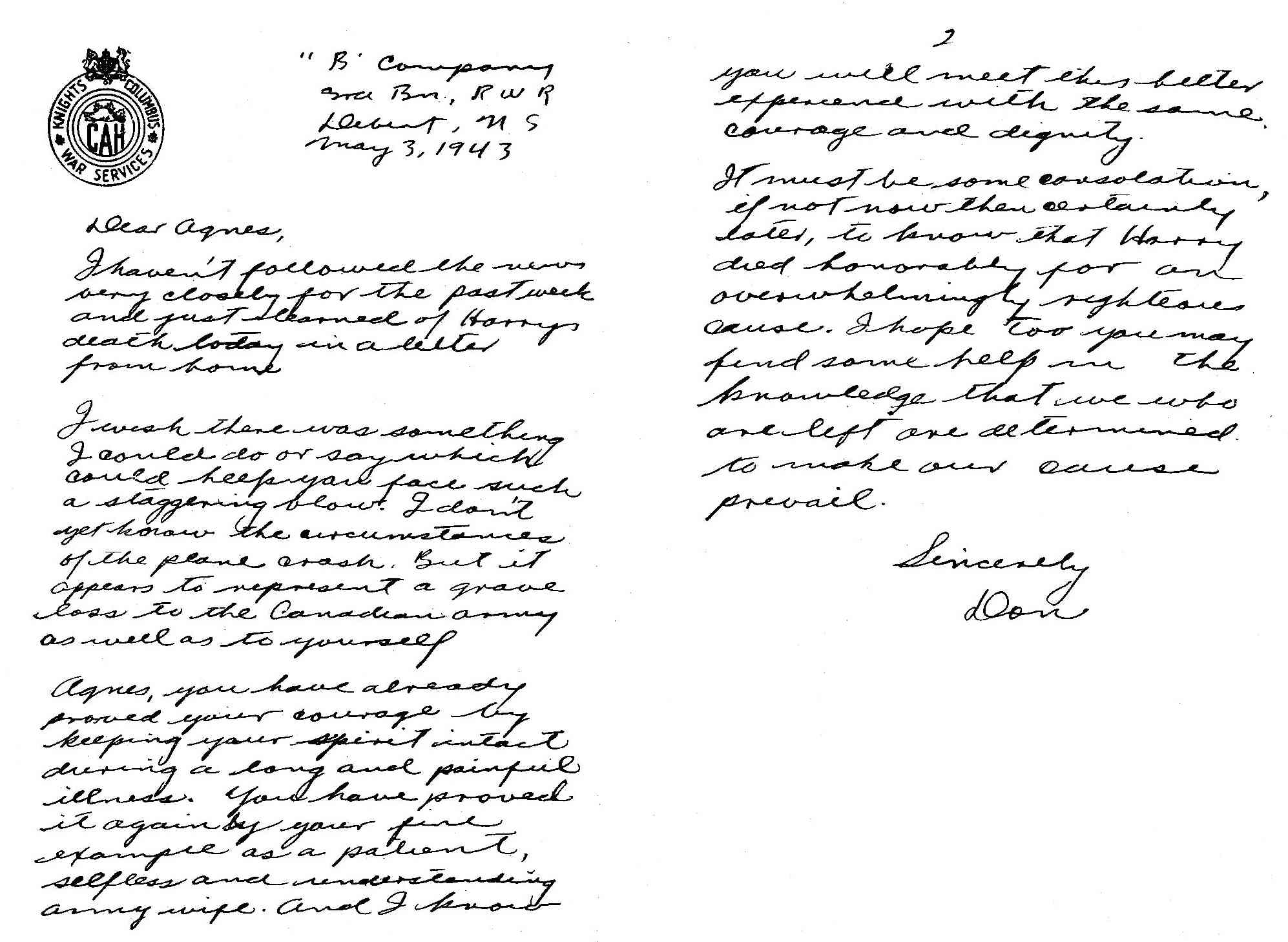 Dorothy and Arni Coulter—“He endeared himself to all who knew him. It is impossible to picture that group of boys without Don, the ‘Deacon,’ as they loved to call him. It won’t be the same now they can’t remind Don to get up in time for parade, remember to wear his hat, pick up his kit bag. The war seems so foreign to his nature, and yet he, more than the majority, knew what he was fighting for, and how great the sacrifice.”