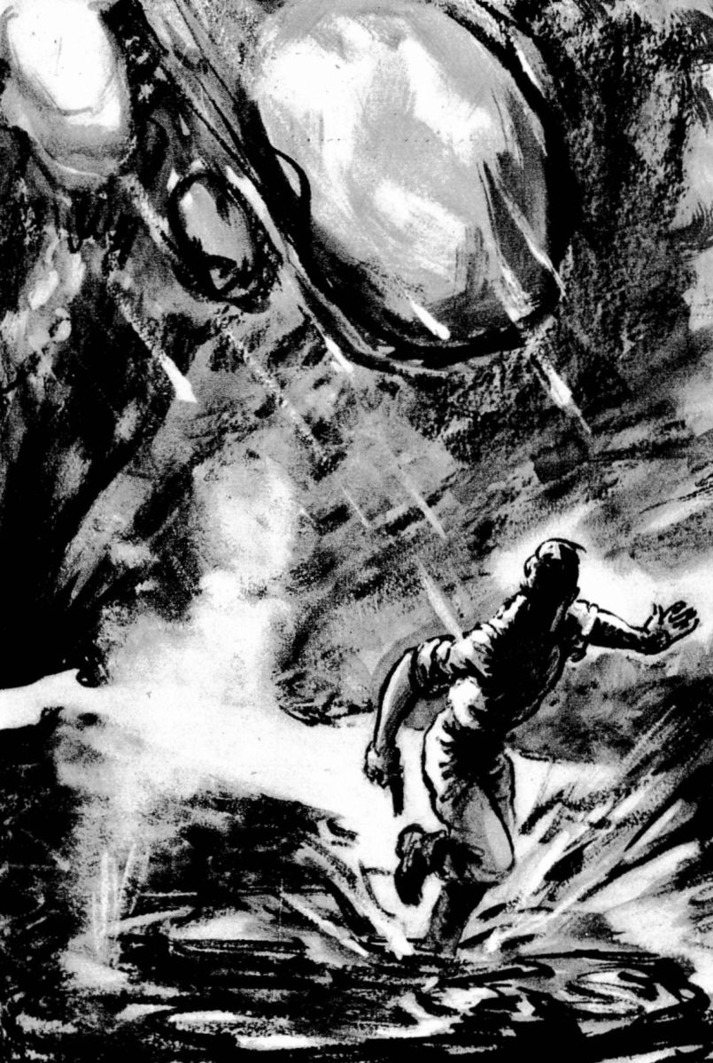 He cried out as a wave of water poured round his legs, causing him to stumble and fall; but he was up again in a moment, plunging on. It occurred to him that this must be the water from the pool. It had been tipped out of its bed by the upheaval. A crack opened at his feet. The water poured into it with a tremendous hiss. Steam swirled. He jumped the crack and ran on. Two or three times he fell heavily, but he felt no pain. He was conscious only of a frenzy to get out of the cave and die in the open. Gasping he staggered on, clawing his way through clouds of choking dust. Everywhere there was noise. A patch of grey light appeared ahead. Like a blind man he groped for it, and then sank down on the edge of the ravine, fighting for breath, his brain in a whirl.
