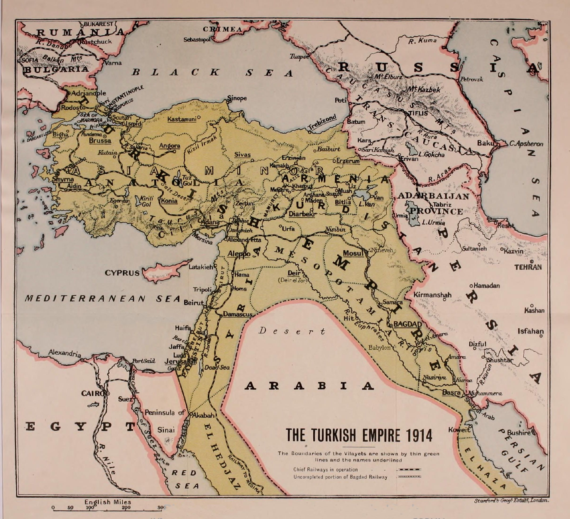 The reader therefore is requested to unthink the present Bagdad Railway altogether, to “scrap” it in his mind, as it will be probably scrapped on the map, since it is utterly useless for our purposes. For taking Aleppo as (roughly) the half-way house in the existent line, we find that the western half of it lies in Asia Minor, in territory which, as we shall see, will remain Turkish, while the eastern half of it makes a long detour instead of striking directly for Bagdad. After our experience with Turkey there is nothing less conceivable than that we should allow a single mile of our new Mesopotamia Railway to run through the territory of the Turks, for who knows that she might not (say when harvests are ripe and ready for delivery), on any arbitrary pretext, close or destroy the line, even as before now she has closed the Dardanelles? Besides, for our purposes, a line that goes to Constantinople (in whosoever hands Constantinople may be after the war) is out of the way and altogether unsuitable. Eastwards, again, from Aleppo the present Bagdad line is circuitous and indirect, admirably adapted to the German purposes for which it was constructed, but utterly unadapted to ours.