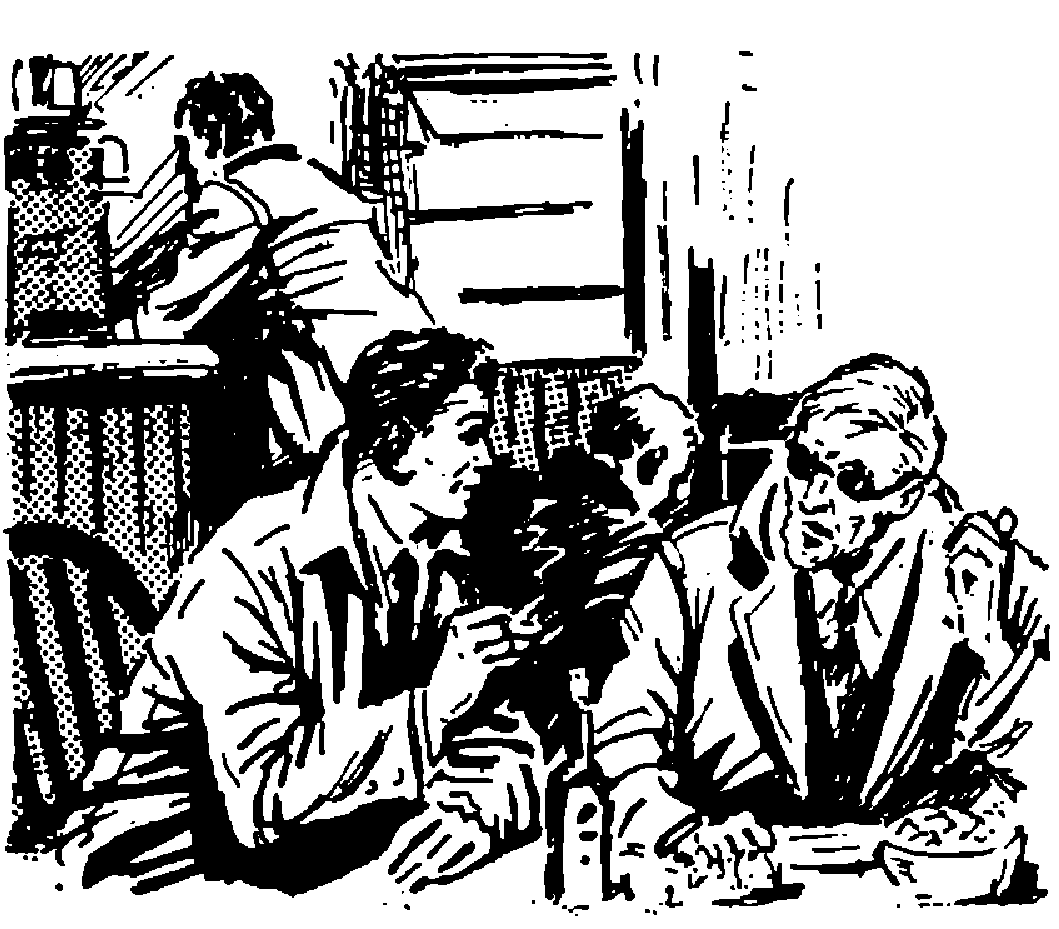 At this point the conversation was interrupted by the arrival of the waitress, notebook in hand, for their order. They both decided on steak and fried potatoes with half a pint of beer.