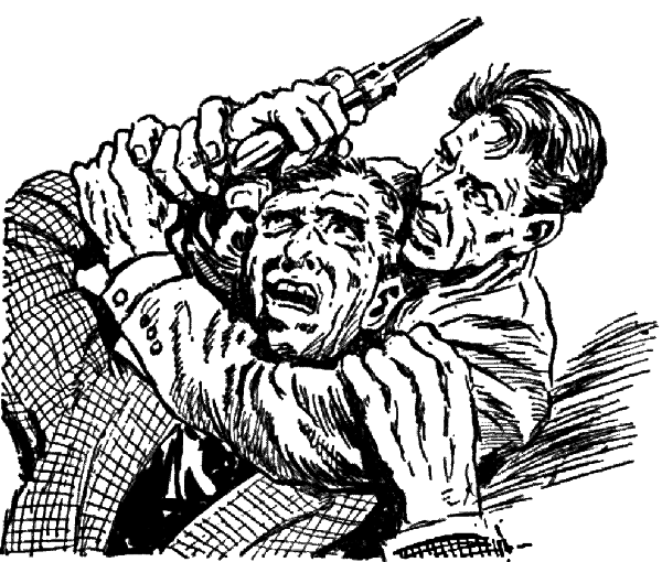 Bertie had recovered sufficiently to go forward to help Biggles, who was now underneath Karkoff and having a bad time as he had to keep one hand employed to prevent Karkoff’s gun from pointing at him. Bertie forced Karkoff’s arm down, and kneeling on it wrenched the gun free. It fell on the grass. But Karkoff, a powerfully built man, was not finished. Still fighting like a maniac he managed to get to his feet, and hurling Bertie aside with a sweep of his arm made a dive for the front seat of his car. Bertie snatched up the fallen gun but daren’t use it for fear of hitting Biggles.